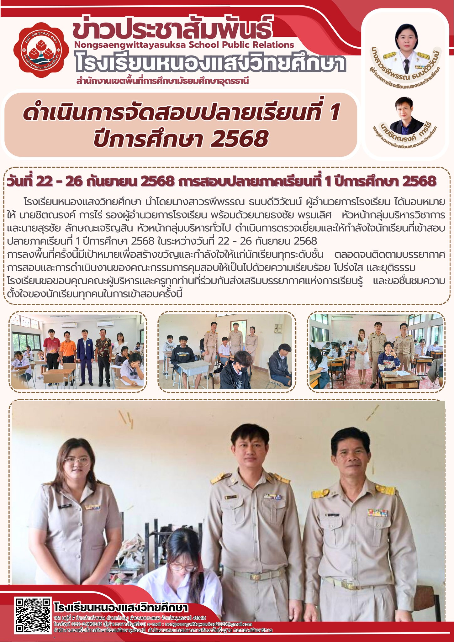 ระหว่างวันที่ 22–26 กันยายน 2568 นางสาวรพีพรรณ ธนบดีวิวัฒน์ ผู้อำนวยการโรงเรียน มอบหมายให้ นายชิตณรงค์ การไร่ รองผู้อำนวยการโรงเรียน พร้อมคณะ ลงพื้นที่ตรวจเยี่ยมและให้กำลังใจนักเรียนที่เข้าสอบปลายภาคเรียนที่ 1