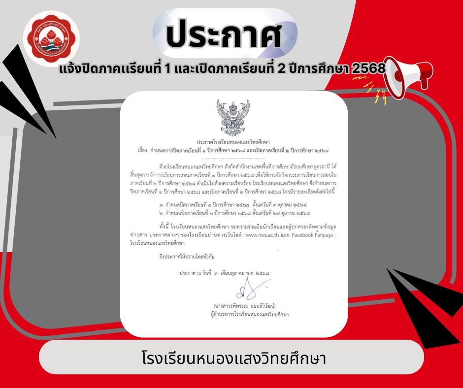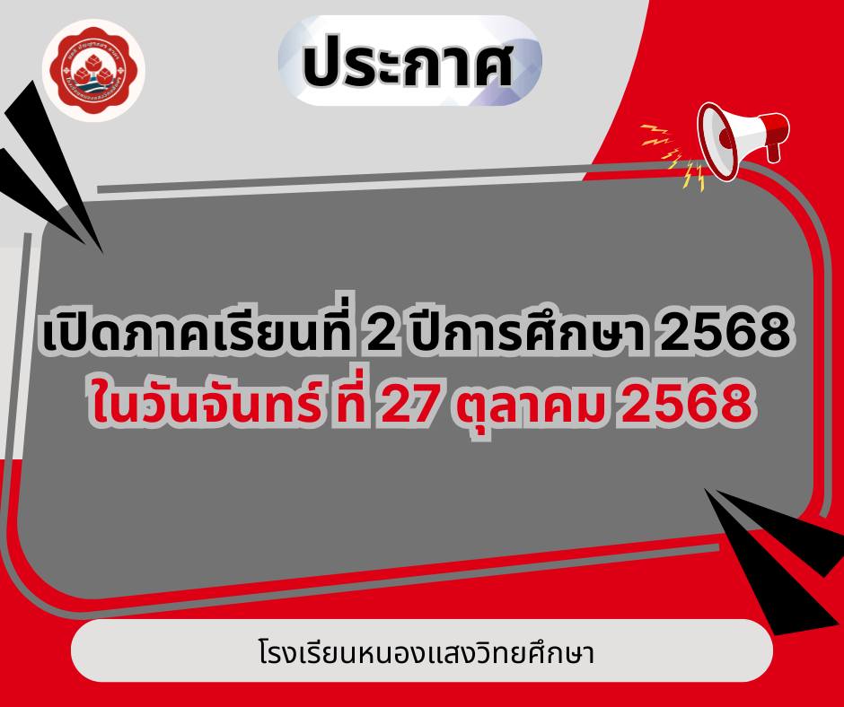 ตามที่กระทรวงศึกษาธิการได้กำหนดให้สถานศึกษาทุกแห่งปิดภาคเรียนที่ 1 ปีการศึกษา 2568 ในช่วงเดือนตุลาคม และเปิดภาคเรียนที่ 2 ในเดือนตุลาคมนั้น โรงเรียนหนองแสงวิทยศึกษา ขอแจ้งกำหนดการปิดและเปิดภาคเรียน ดังนี้