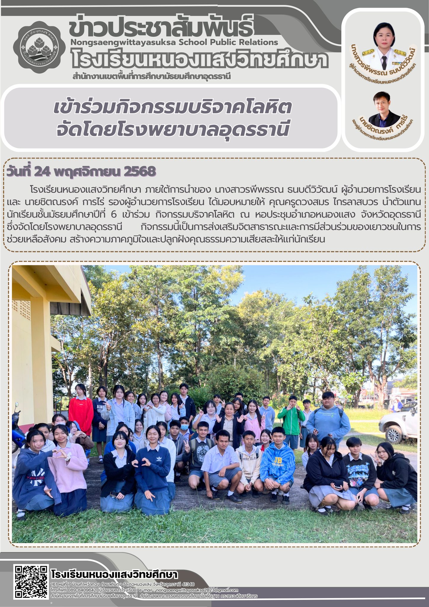 📌 24 พฤศจิกายน 2568 โรงเรียนหนองแสงวิทยศึกษา ภายใต้การนำของ นางสาวรพีพรรณ ธนบดีวิวัฒน์ ผู้อำนวยการ และ นายชิตณรงค์ การไร่ รองผู้อำนวยการ มอบหมายให้ ครูดวงสมร ไกรลาสบวร นำตัวแทนนักเรียน ม.6 เข้าร่วม กิจกรรมบริจาคโลหิต ณ หอประชุมอำเภอหนองแสง จังหวัดอุดรธานี จัดโดยโรงพยาบาลอุดรธานี