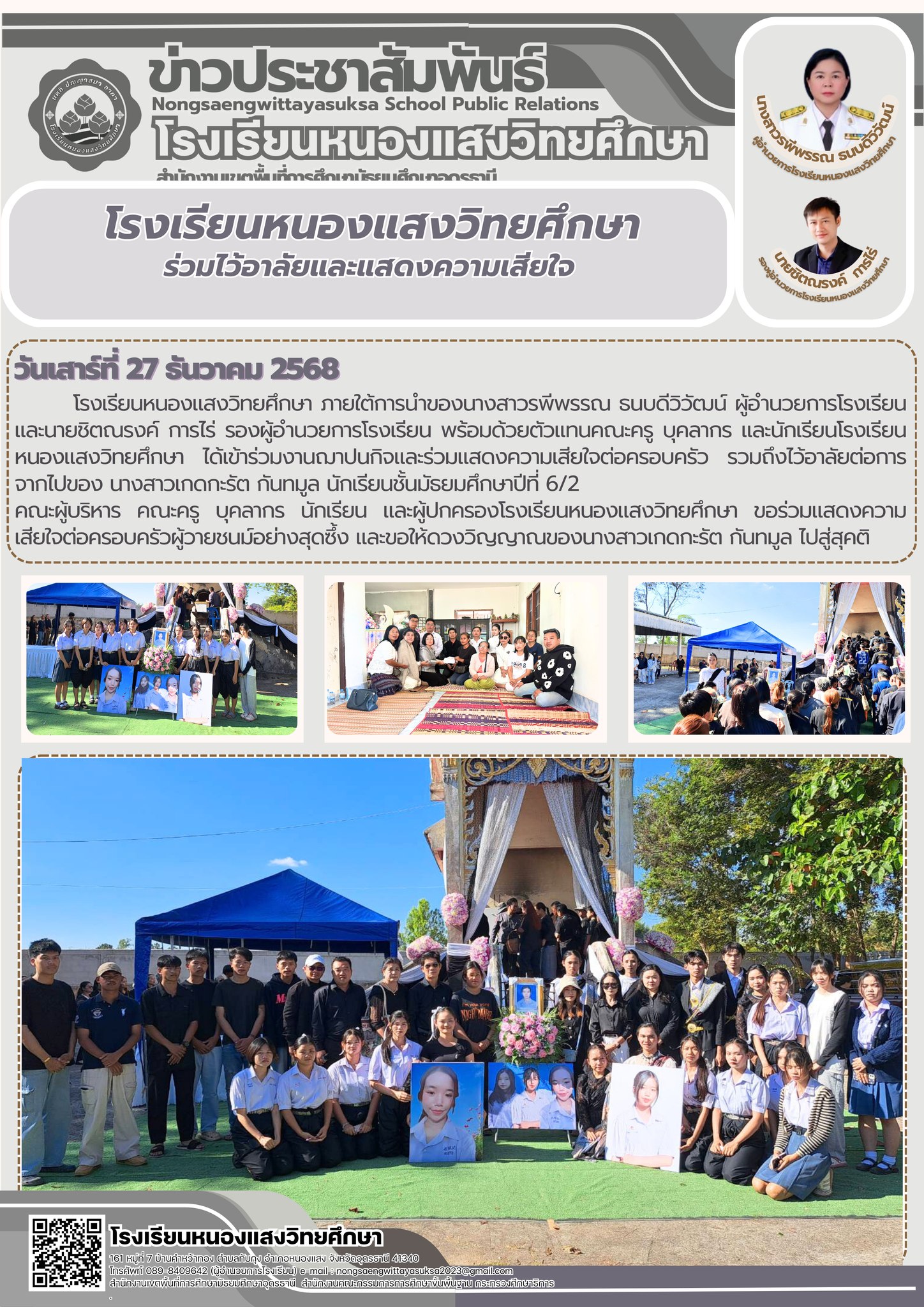 คณะผู้บริหาร คณะครู บุคลากร นักเรียน และผู้ปกครองโรงเรียนหนองแสงวิทยศึกษา ขอร่วมแสดงความเสียใจอย่างสุดซึ้งต่อครอบครัวผู้วายชนม์ และขอให้ดวงวิญญาณไปสู่สุคติ