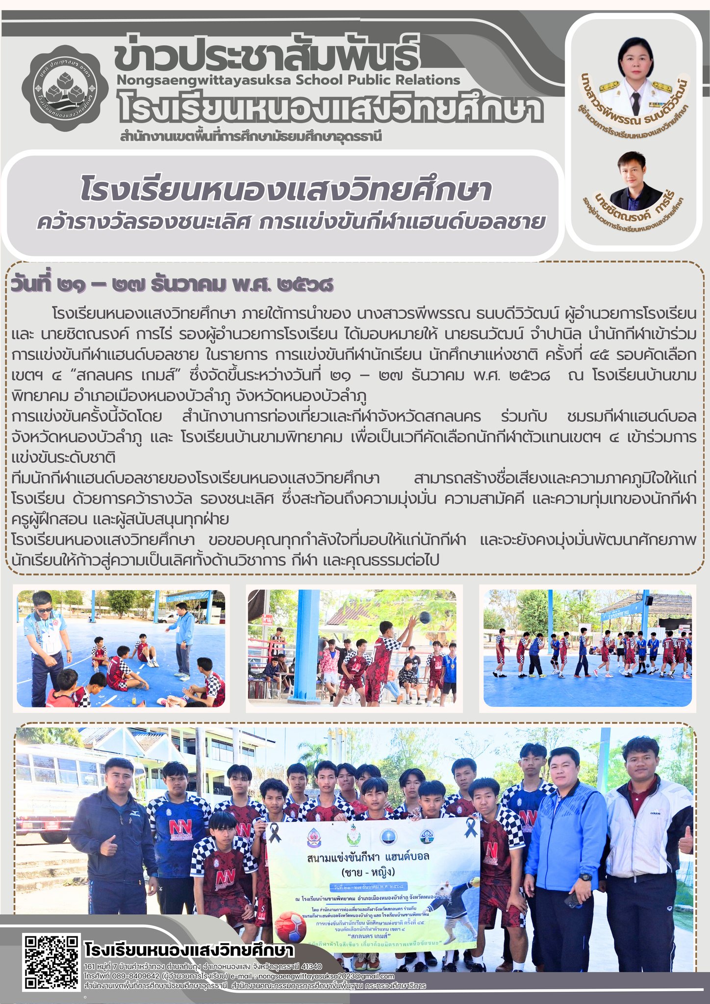 ภายใต้การนำของ นางสาวรพีพรรณ ธนบดีวิวัฒน์ ผู้อำนวยการโรงเรียน และ นายชิตณรงค์ การไร่ รองผู้อำนวยการโรงเรียน ได้มอบหมายให้ นายธนวัฒน์ จำปานิล นำนักกีฬาแฮนด์บอลชายเข้าร่วมการแข่งขัน กีฬานักเรียน นักศึกษาแห่งชาติ ครั้งที่ ๔๕ รอบคัดเลือกเขตฯ ๔ “สกลนคร เกมส์”