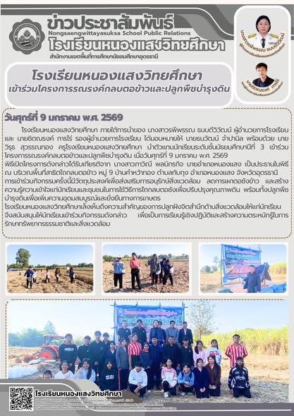 ได้มอบหมายให้ นายธนวัฒน์ จำปานิล พร้อมด้วย นายวิรุธ สุวรรณทอง นำตัวแทนนักเรียนระดับชั้น ม.3 เข้าร่วม โครงการรณรงค์กลบตอข้าวและปลูกพืชบำรุงดิน