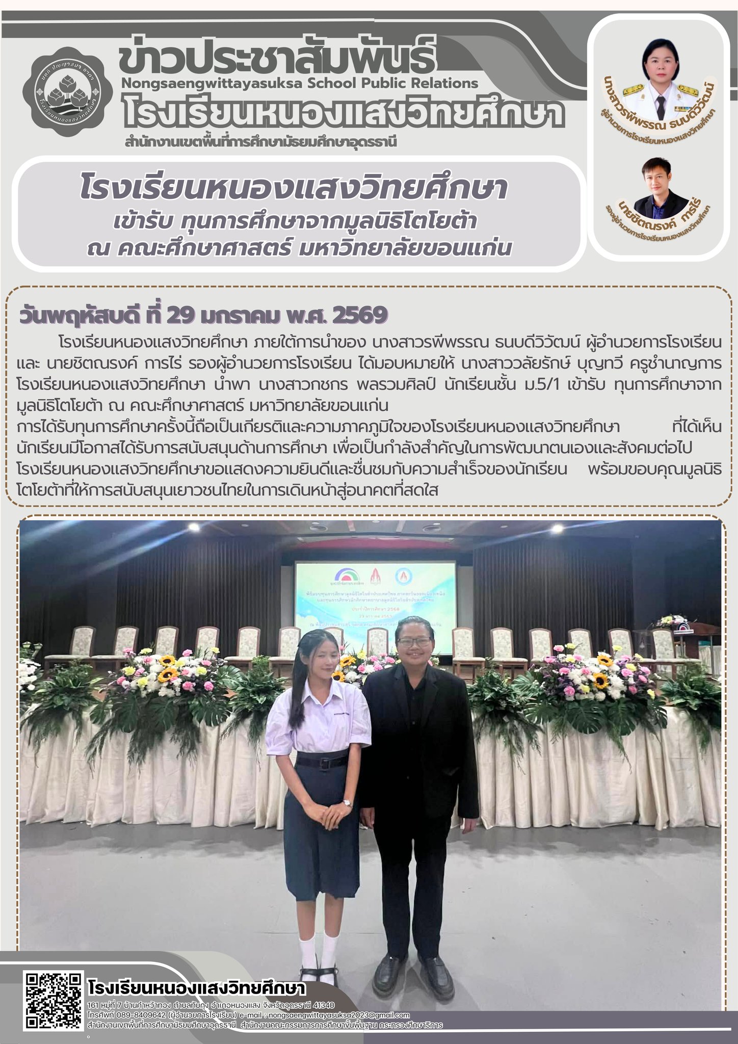 ภายใต้การนำของ นางสาวรพีพรรณ ธนบดีวิวัฒน์ ผู้อำนวยการโรงเรียน และ นายชิตณรงค์ การไร่ รองผู้อำนวยการโรงเรียน ได้มอบหมายให้ นางสาววลัยรักษ์ บุญทวี ครูชำนาญการ นำพา นางสาวกชกร พลรวมศิลป์ นักเรียนชั้น ม.5/1 เข้ารับ ทุนการศึกษาจากมูลนิธิโตโยต้า ณ คณะศึกษาศาสตร์ มหาวิทยาลัยขอนแก่น