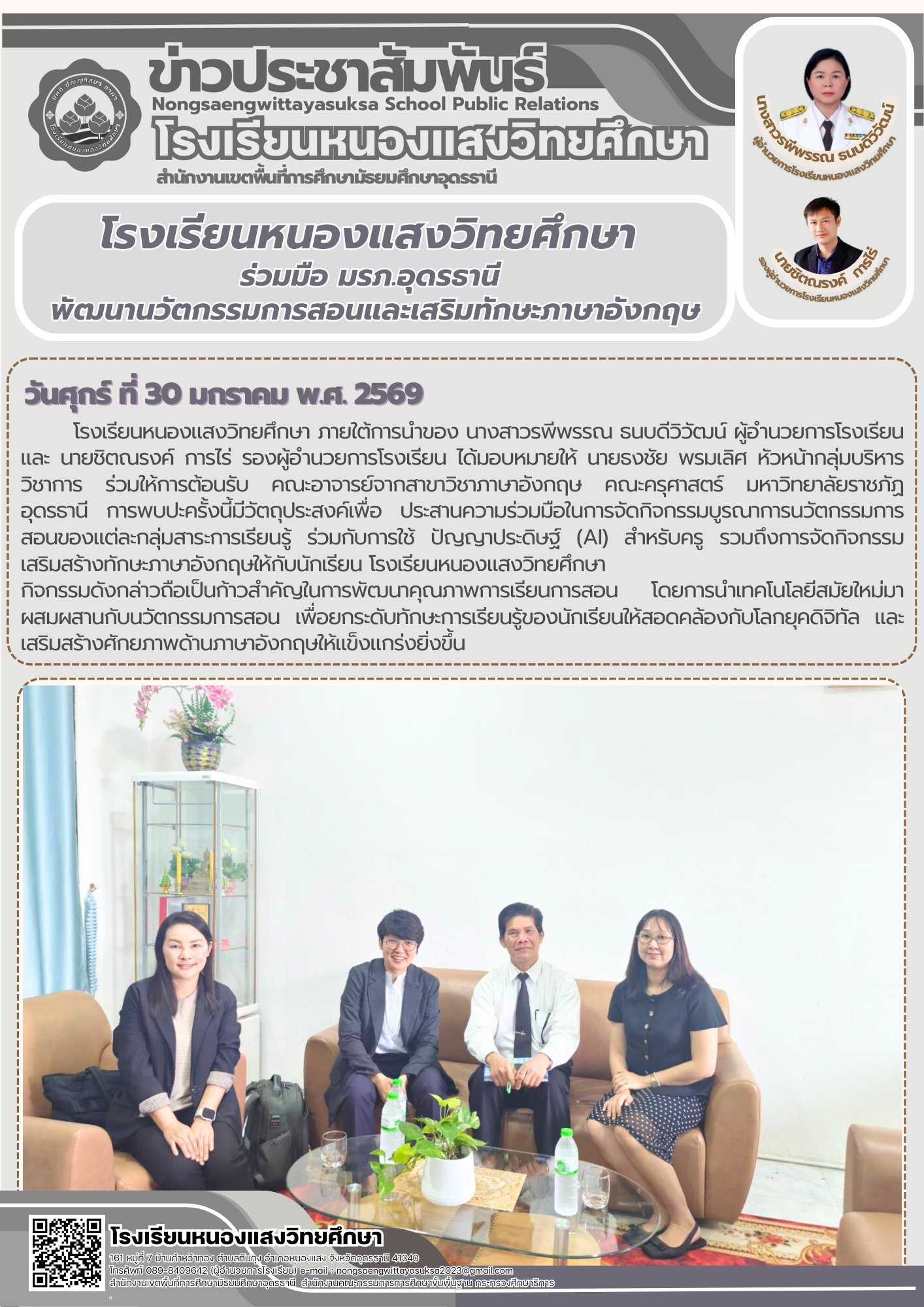 การพบปะครั้งนี้มีเป้าหมายเพื่อ ประสานความร่วมมือในการจัดกิจกรรมบูรณาการนวัตกรรมการสอนของแต่ละกลุ่มสาระฯ ร่วมกับการใช้ ปัญญาประดิษฐ์ (AI) สำหรับครู รวมถึงการจัดกิจกรรม เสริมสร้างทักษะภาษาอังกฤษให้กับนักเรียน โรงเรียนหนองแสงวิทยศึกษา