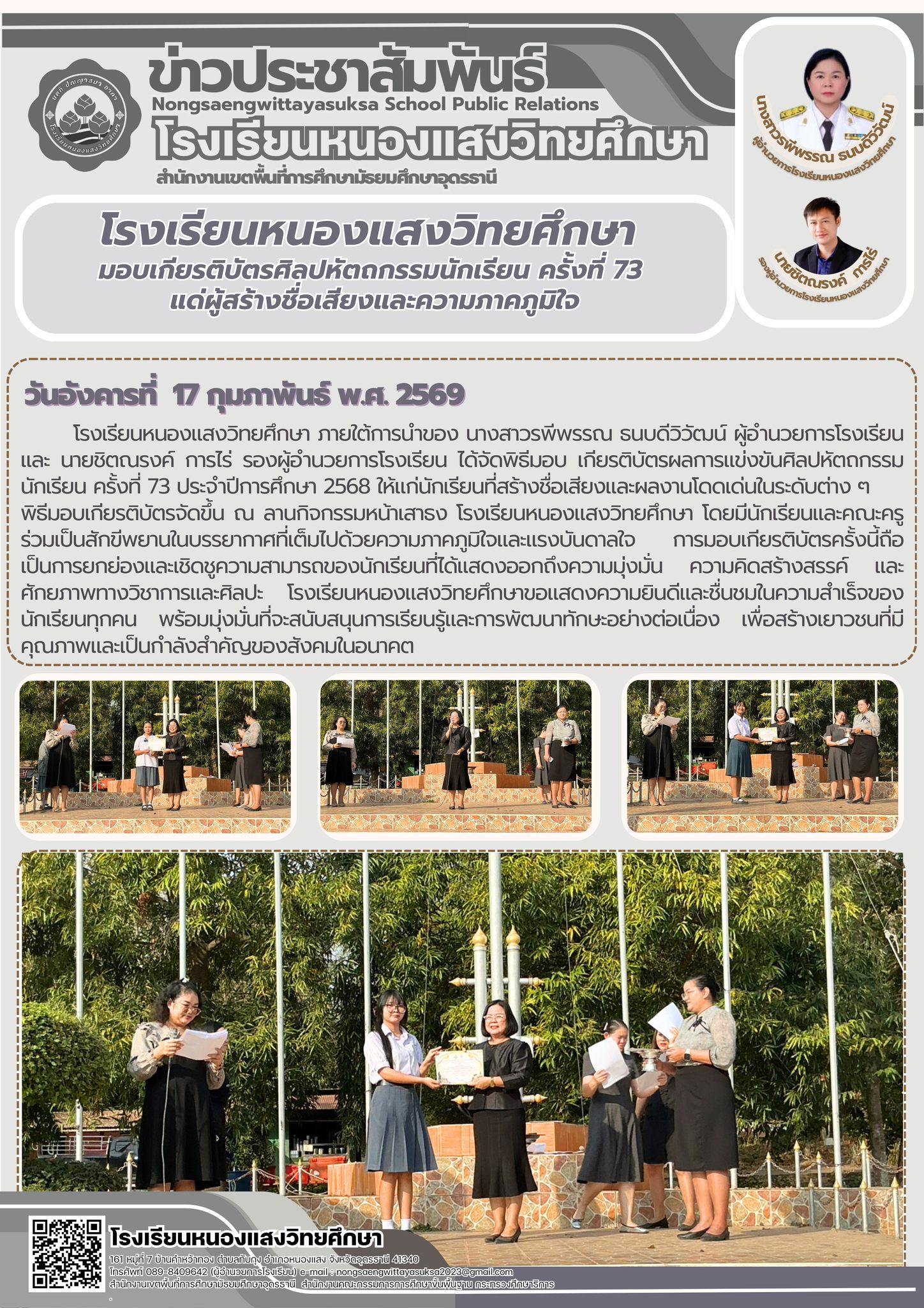 ภายใต้การนำของ นางสาวรพีพรรณ ธนบดีวิวัฒน์ ผู้อำนวยการโรงเรียน และ นายชิตณรงค์ การไร่ รองผู้อำนวยการโรงเรียน โดยในวันนี้ นางสาวรพีพรรณ ธนบดีวิวัฒน์ ผู้อำนวยการโรงเรียน ได้ให้เกียรติมอบ เกียรติบัตรผลการแข่งขันศิลปหัตถกรรมนักเรียน ครั้งที่ 73 ปีการศึกษา 2568 แก่นักเรียนที่สร้างชื่อเสียงและผลงานโดดเด่น