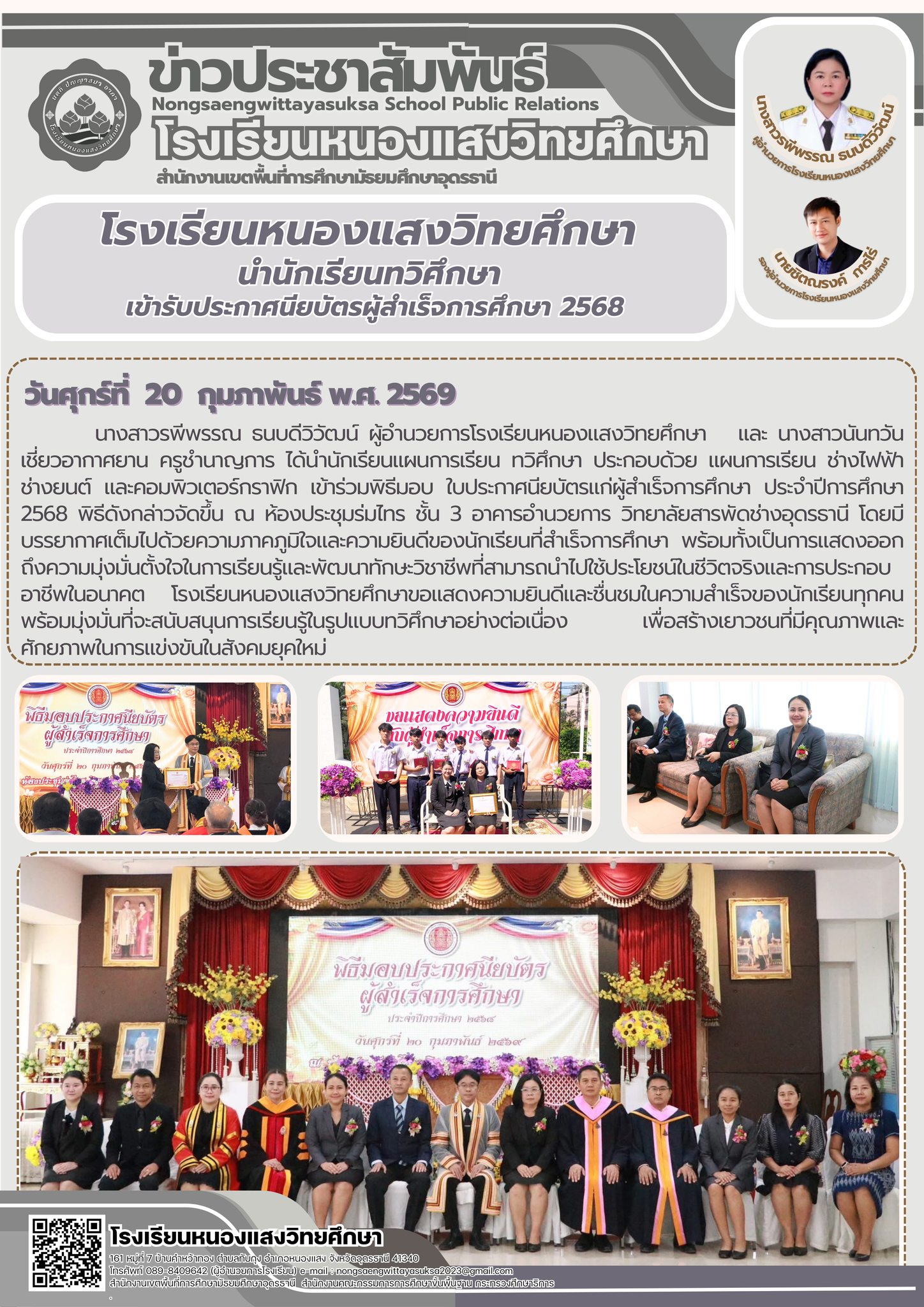 นางสาวรพีพรรณ ธนบดีวิวัฒน์ ผู้อำนวยการโรงเรียน และ นางสาวนันทวัน เชี่ยวอากาศยาน ครูชำนาญการ ได้นำนักเรียนแผนการเรียน ทวิศึกษา ได้แก่ ช่างไฟฟ้า ช่างยนต์ และคอมพิวเตอร์กราฟิก เข้าร่วมพิธีมอบ ใบประกาศนียบัตรแก่ผู้สำเร็จการศึกษา ประจำปีการศึกษา 2568