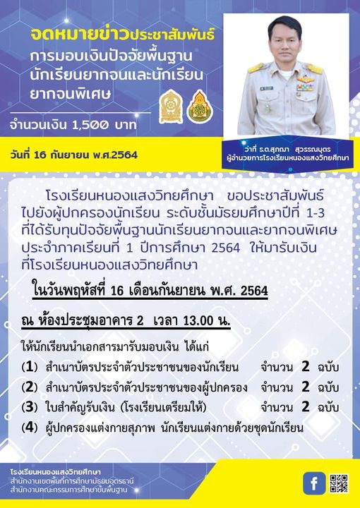 แจ้งเรื่องการมอบเงินปัจจัยพื้นฐานนักเรียนยากจนและนักเรียนยากจนพิเศษ จำนวน 1,500 บาท