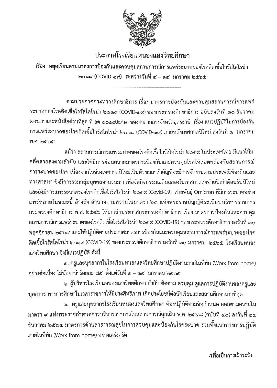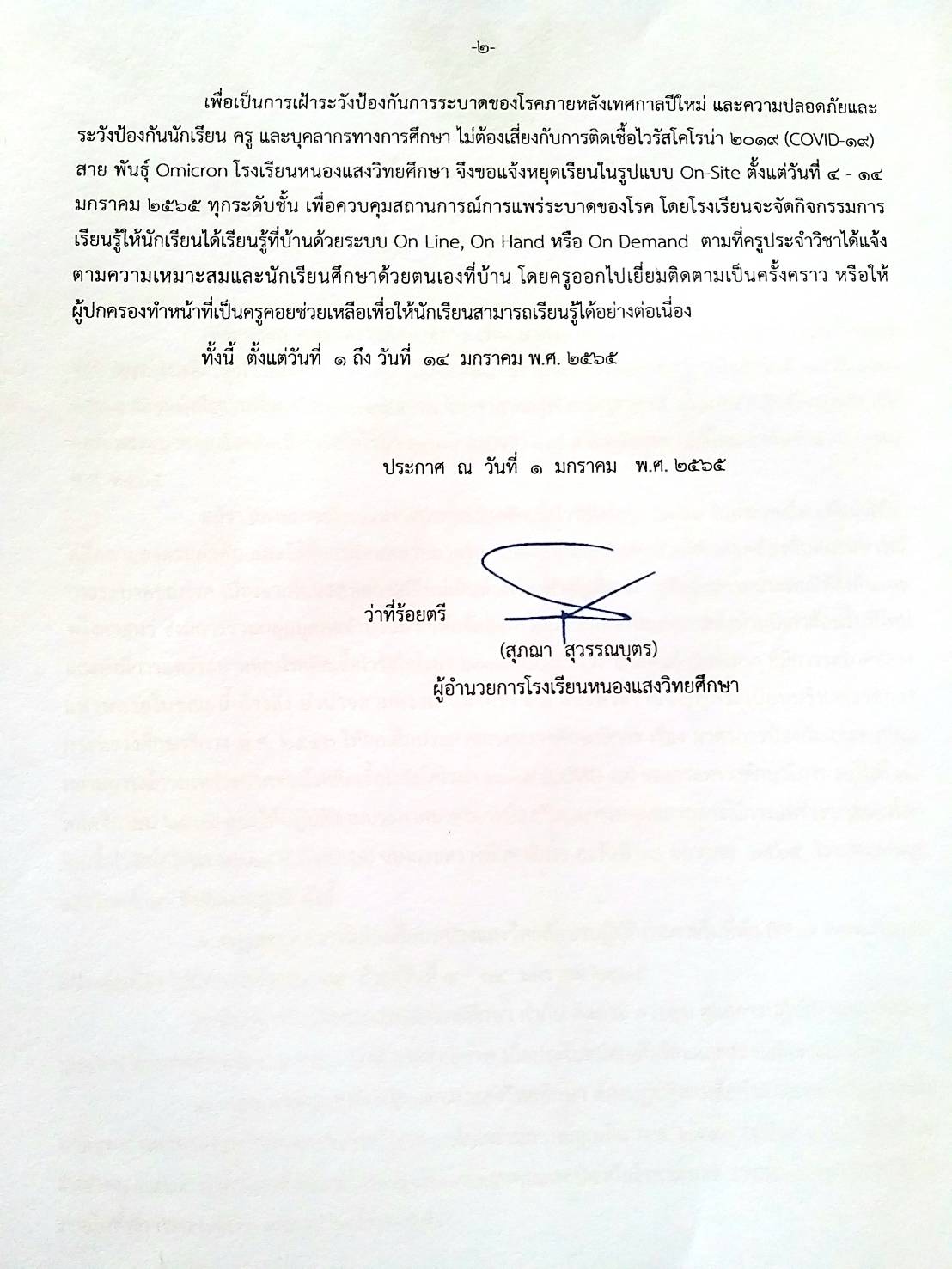 ทางโรงเรียนของดการเรียนการสอนแบบ onsite ระหว่างวันที่ 4 - 7 และ 10 - 14 มกราคม 2565 ตามแนวทางปฏิบัติในการป้องกันการแพร่ระบาดของโรคโควิด-19 โดยให้จัดการเรียนการสอนในรูปแบบ online และ ondemand