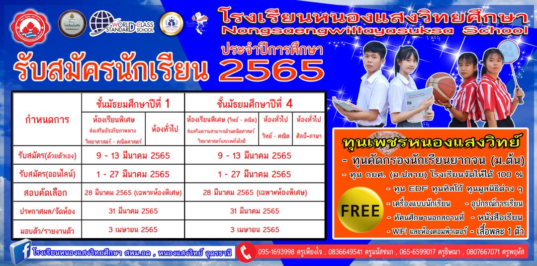 📍โรงเรียนหนองแสงวิทยศึกษา 🙋🙋♀️ เปิดรับสมัครนักเรียน ชั้นมัธยมศึกษาปีที่ 1 และ 4 ประจำปีการศึกษา 2565