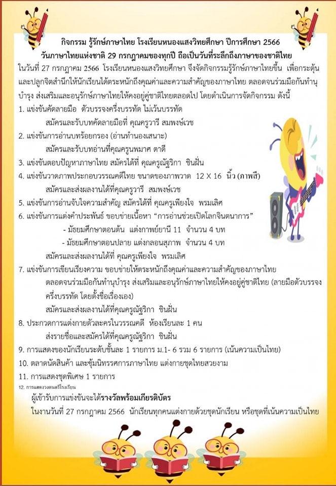 📣📣กลุ่มสาระการเรียนรู้ภาษาไทย ขอเชิญชวนนักเรียนร่วม✨กิจกรรมวันสุนทรภู่สู่วันภาษาไทยแห่งชาติ ปีการศึกษา 2566​ ในวันที่​ 27​ กรกฎาคม​ 2566​ โดยมีกิจกรรม​ ดังนี้​ 👇👇👇👇
