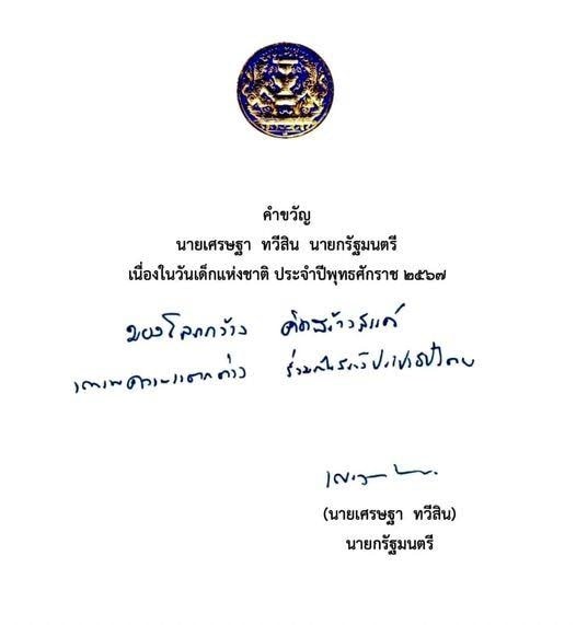 คำขวัญวันเด็ก 2567 โดย นายเศรษฐา ทวีสิน นายกรัฐมนตรี