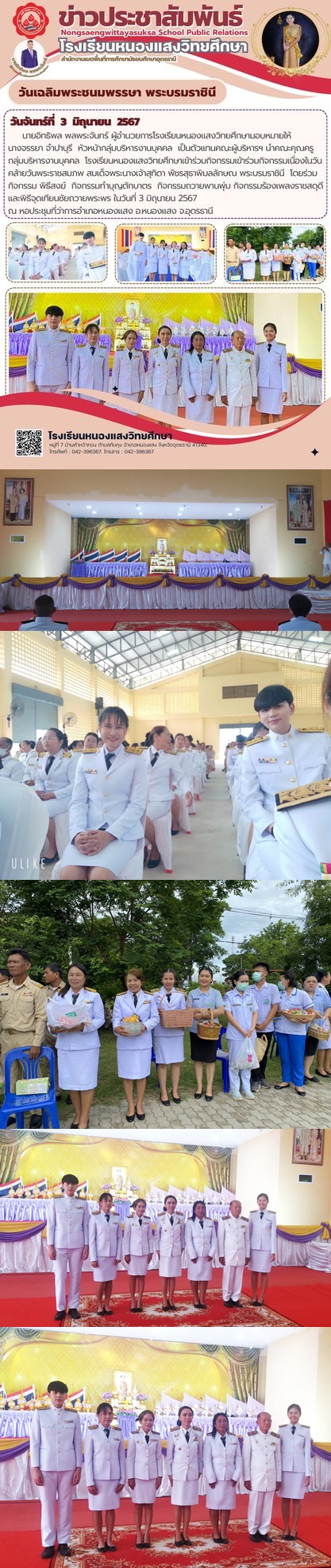 นายอิทธิพล พลพระจันทร์ ผู้อำนวยการโรงเรียนหนองแสงวิทยศึกษามอบหมายให้นางจรรยา จำปาบุรี หัวหน้ากลุ่มบริหารงานบุคคล เป็นตัวแทนคณะผู้บริหารฯ นำคณะคุณครู กลุ่มบริหารงานบุคคล โรงเรียนหนองแสงวิทยศึกษาเข้าร่วมกิจกรรมเข้าร่วมกิจกรรมเนื่องในวันคล้ายวันพระราชสมภพ สมเด็จพระนางเจ้าสุทิดา พัชรสุธาพิมลลักษณ พระบรมราชินี โดยร่วมกิจกรรม พิธีสงฆ์ กิจกรรมทำบุญตักบาตร กิจกรรมถวายพานพุ่ม กิจกรรมร้องเพลงราชสดุดีและพิธีจุดเทียนชัยถวายพระพร ในวันที่ 3 มิถุนายน 2567