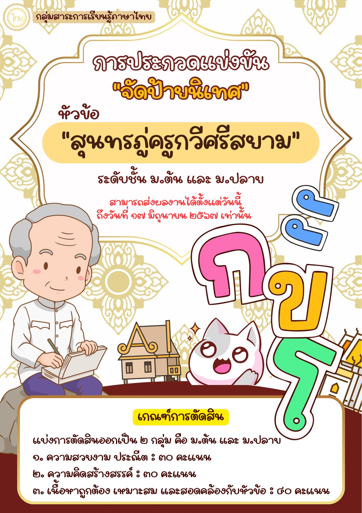 ขอเชิญนักเรียนทุกระดับชั้น ทุกห้องเรียน เข้าร่วมการประกวด “จัดป้ายนิเทศ” ในหัวข้อ “สุนทรภู่ครูกวีศรีสยาม”