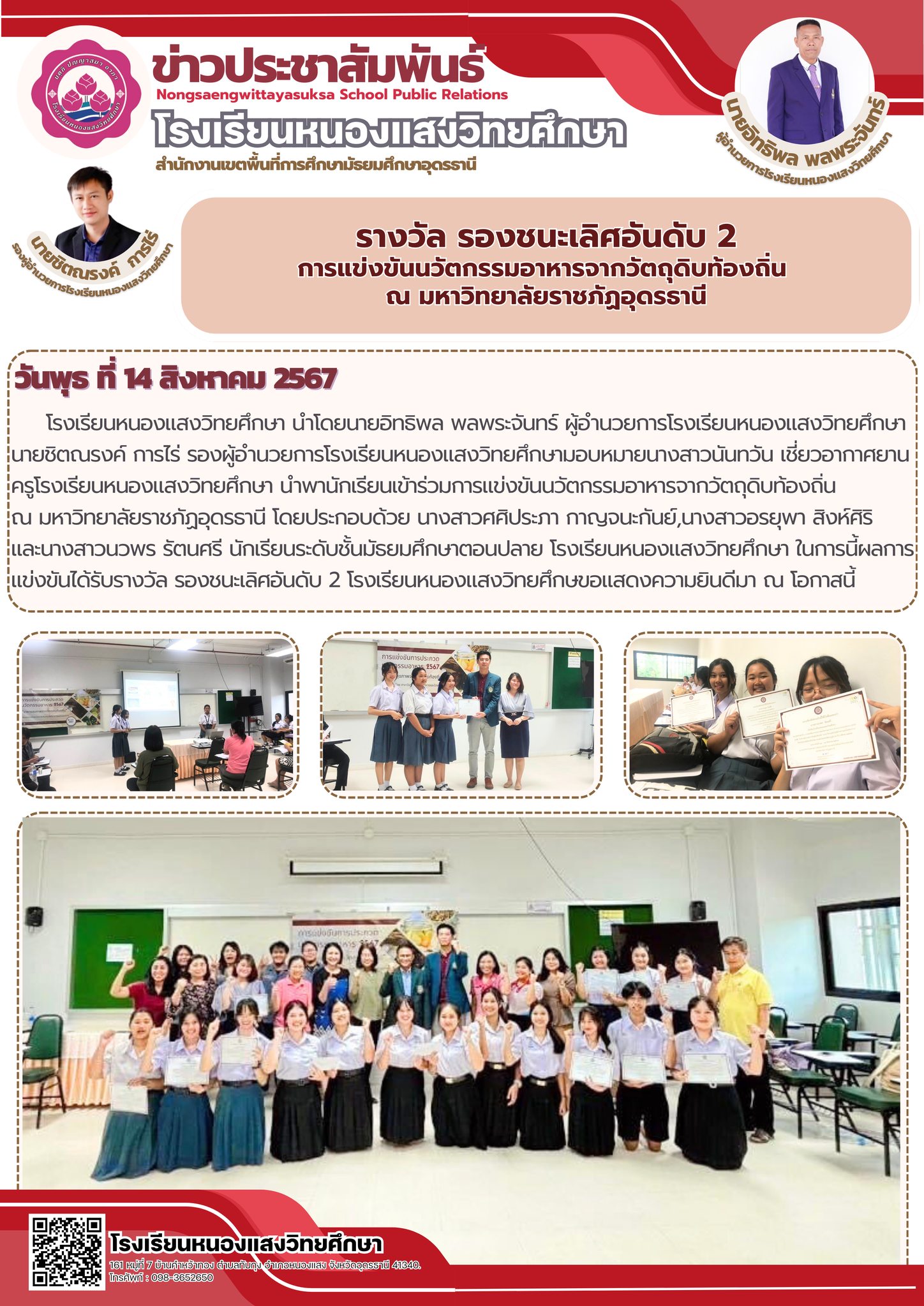 โรงเรียนหนองแสงวิทยศึกษา นำโดยนายอิทธิพล พลพระจันทร์ ผู้อำนวยการโรงเรียนหนองแสงวิทยศึกษา นายชิตณรงค์ การไร่ รองผู้อำนวยการโรงเรียนหนองแสงวิทยศึกษามอบหมายนางสาวนันทวัน เชี่ยวอากาศยาน ครูโรงเรียนหนองแสงวิทยศึกษา นำพานักเรียนเข้าร่วมการแข่งขันนวัตกรรมอาหารจากวัตถุดิบท้องถิ่น ณ มหาวิทยาลัยราชภัฏอุดรธานี โดยประกอบด้วย นางสาวศศิประภา กาญจนะกันย์,นางสาวอรยุพา สิงห์ศิริ และนางสาวนวพร รัตนศรี นักเรียนระดับชั้นมัธยมศึกษาตอนปลาย โรงเรียนหนองแสงวิทยศึกษา ในการนี้ผลการแข่งขันได้รับรางวัล รองชนะเลิศอันดับ 2 โรงเรียนหนองแสงวิทยศึกษขอแสดงความยินดีมา ณ โอกาสนี้