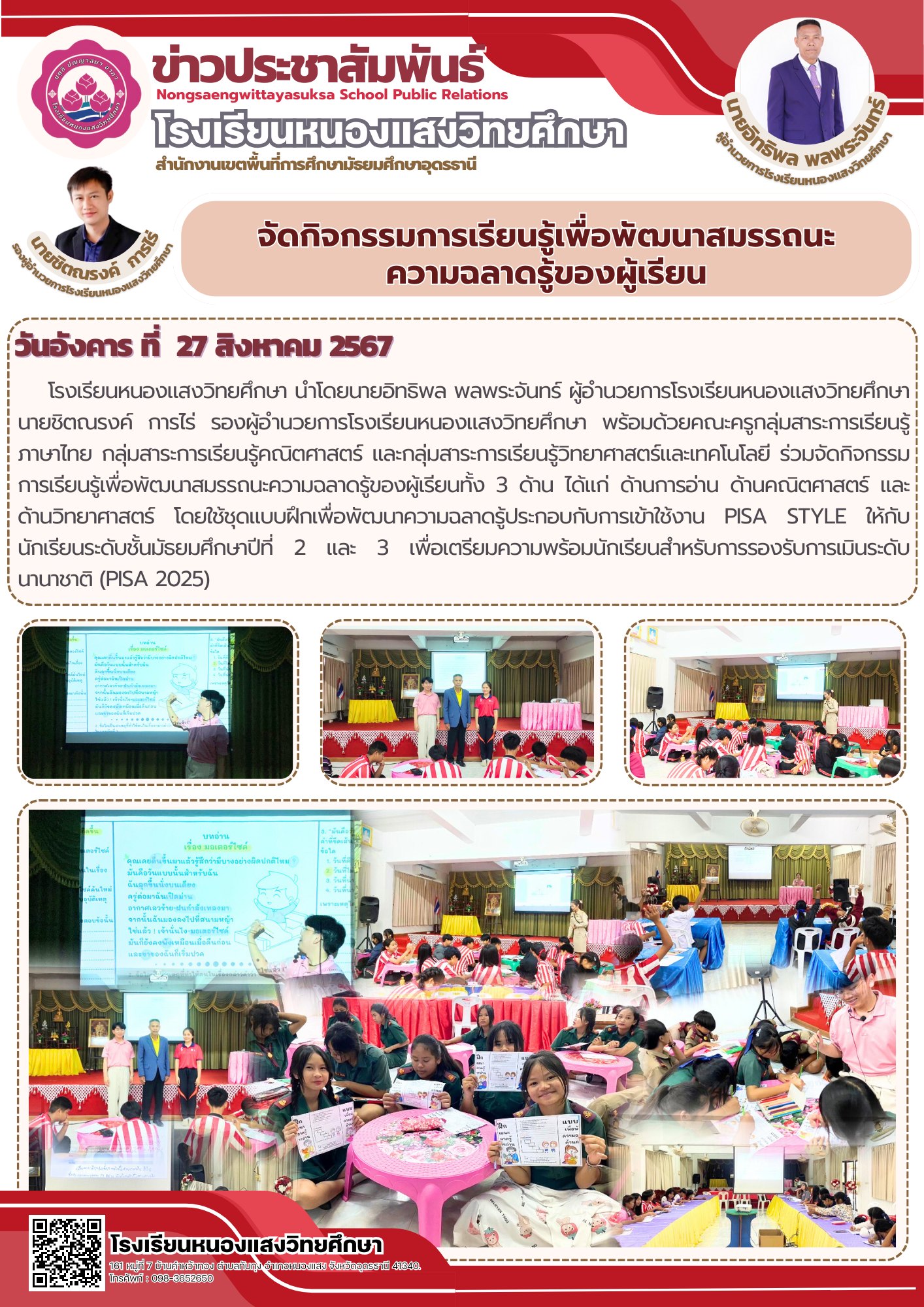 โรงเรียนหนองแสงวิทยศึกษา นำโดยนายอิทธิพล พลพระจันทร์ ผู้อำนวยการโรงเรียนหนองแสงวิทยศึกษา นายชิตณรงค์ การไร่ รองผู้อำนวยการโรงเรียนหนองแสงวิทยศึกษา พร้อมด้วยคณะครูกลุ่มสาระการเรียนรู้ภาษาไทย กลุ่มสาระการเรียนรู้คณิตศาสตร์ และกลุ่มสาระการเรียนรู้วิทยาศาสตร์และเทคโนโลยี ร่วมจัดกิจกรรมการเรียนรู้เพื่อพัฒนาสมรรถนะความฉลาดรู้ของผู้เรียนทั้ง 3 ด้าน ได้แก่ ด้านการอ่าน ด้านคณิตศาสตร์ และด้านวิทยาศาสตร์ โดยใช้ชุดแบบฝึกเพื่อพัฒนาความฉลาดรู้ประกอบกับการเข้าใช้งาน PISA Style ให้กับนักเรียนระดับชั้นมัธยมศึกษาปีที่ 2 และ 3 เพื่อเตรียมความพร้อมนักเรียนสำหรับการรองรับการเมินระดับนานาชาติ (PISA 2025)
