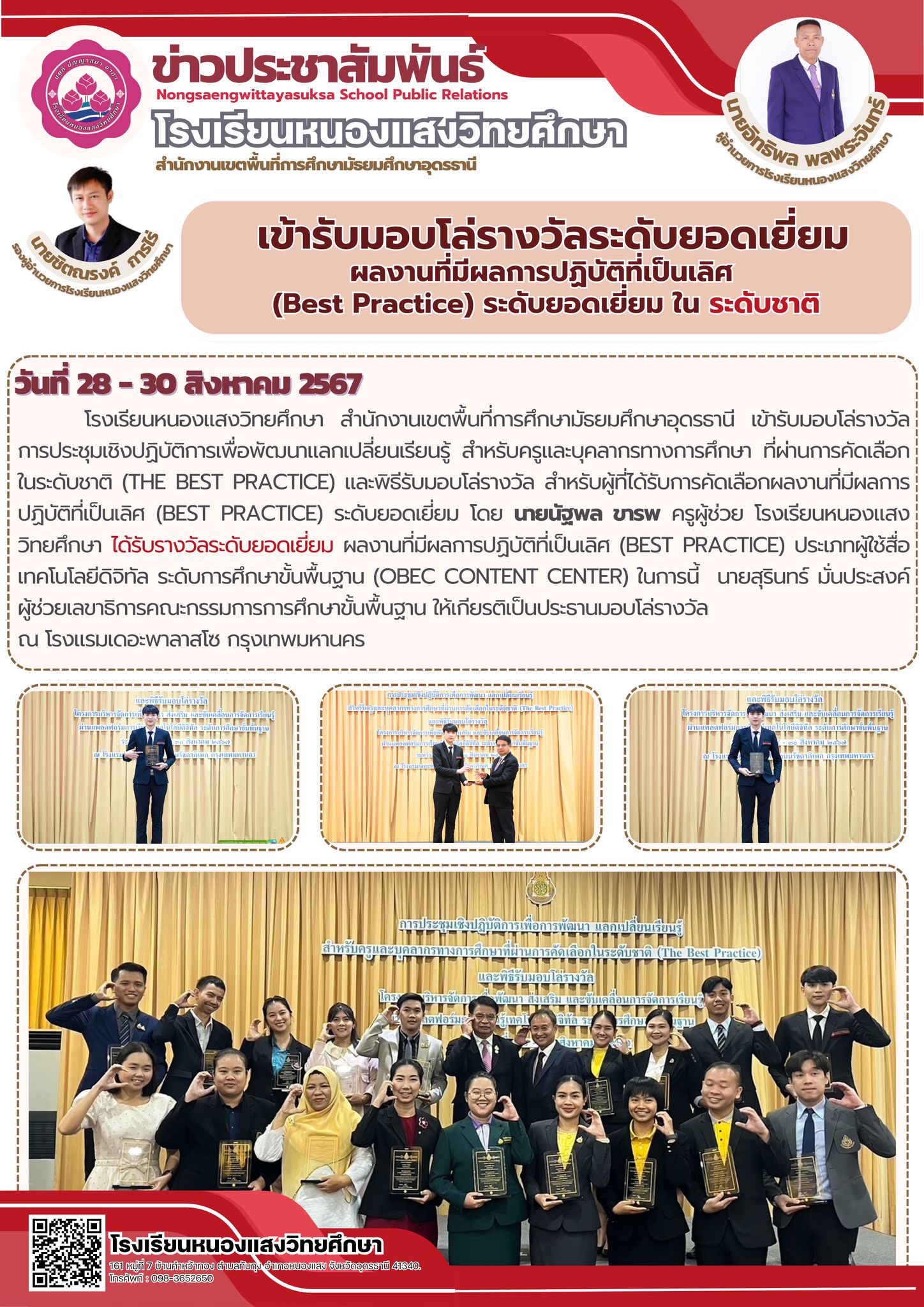 โรงเรียนหนองแสงวิทยศึกษา สำนักงานเขตพื้นที่การศึกษามัธยมศึกษาอุดรธานี เข้ารับมอบโล่รางวัล การประชุมเชิงปฏิบัติการเพื่อพัฒนาแลกเปลี่ยนเรียนรู้ สำหรับครูและบุคลากรทางการศึกษา ที่ผ่านการคัดเลือกในระดับชาติ (The Best Practice) และพิธีรับมอบโล่รางวัล สำหรับผู้ที่ได้รับการคัดเลือกผลงานที่มีผลการปฏิบัติที่เป็นเลิศ (Best Practice) ระดับยอดเยี่ยม โดย นายนัฐพล ขารพ ครูผู้ช่วย โรงเรียนหนองแสงวิทยศึกษา ได้รับรางวัลระดับยอดเยี่ยม ผลงานที่มีผลการปฏิบัติที่เป็นเลิศ (Best Practice) ประเภทผู้ใช้สื่อเทคโนโลยีดิจิทัล ระดับการศึกษาขั้นพื้นฐาน (OBEC Content Center) ในการนี้ นายสุรินทร์ มั่นประสงค์ ผู้ช่วยเลขาธิการคณะกรรมการการศึกษาขั้นพื้นฐาน ให้เกียรติเป็นประธานมอบโล่รางวัล ณ โรงแรมเดอะพาลาสโซ กรุงเทพมหานคร