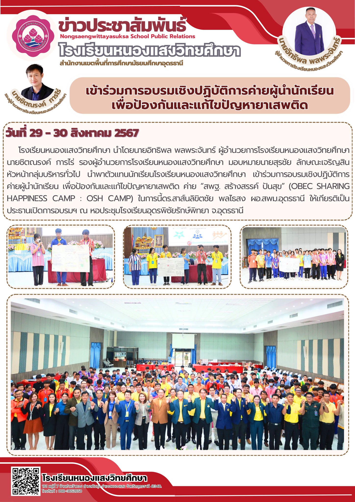 โรงเรียนหนองแสงวิทยศึกษา นำโดยนายอิทธิพล พลพระจันทร์ ผู้อำนวยการโรงเรียนหนองแสงวิทยศึกษา นายชิตณรงค์ การไร่ รองผู้อำนวยการโรงเรียนหนองแสงวิทยศึกษา มอบหมายนายสุรชัย ลักษณะเจริญสิน หัวหน้ากลุ่มบริหารทั่วไป นำพาตัวแทนนักเรียนโรงเรียนหนองแสงวิทยศึกษา เข้าร่วมการอบรมเชิงปฏิบัติการค่ายผู้นำนักเรียน เพื่อป้องกันและแก้ไขปัญหายาเสพติด ค่าย “สพฐ. สร้างสรรค์ ปันสุข” (OBEC Sharing Happiness Camp : OSH Camp) ในการนี้ดร.สาส์นลิขิตชัย พลไธสง ผอ.สพม.อุดรธานี ให้เกียรติเป็นประธานเปิดการอบรมฯ ณ หอประชุมโรงเรียนอุดรพิชัยรักษ์พิทยา จ.อุดรธานี
