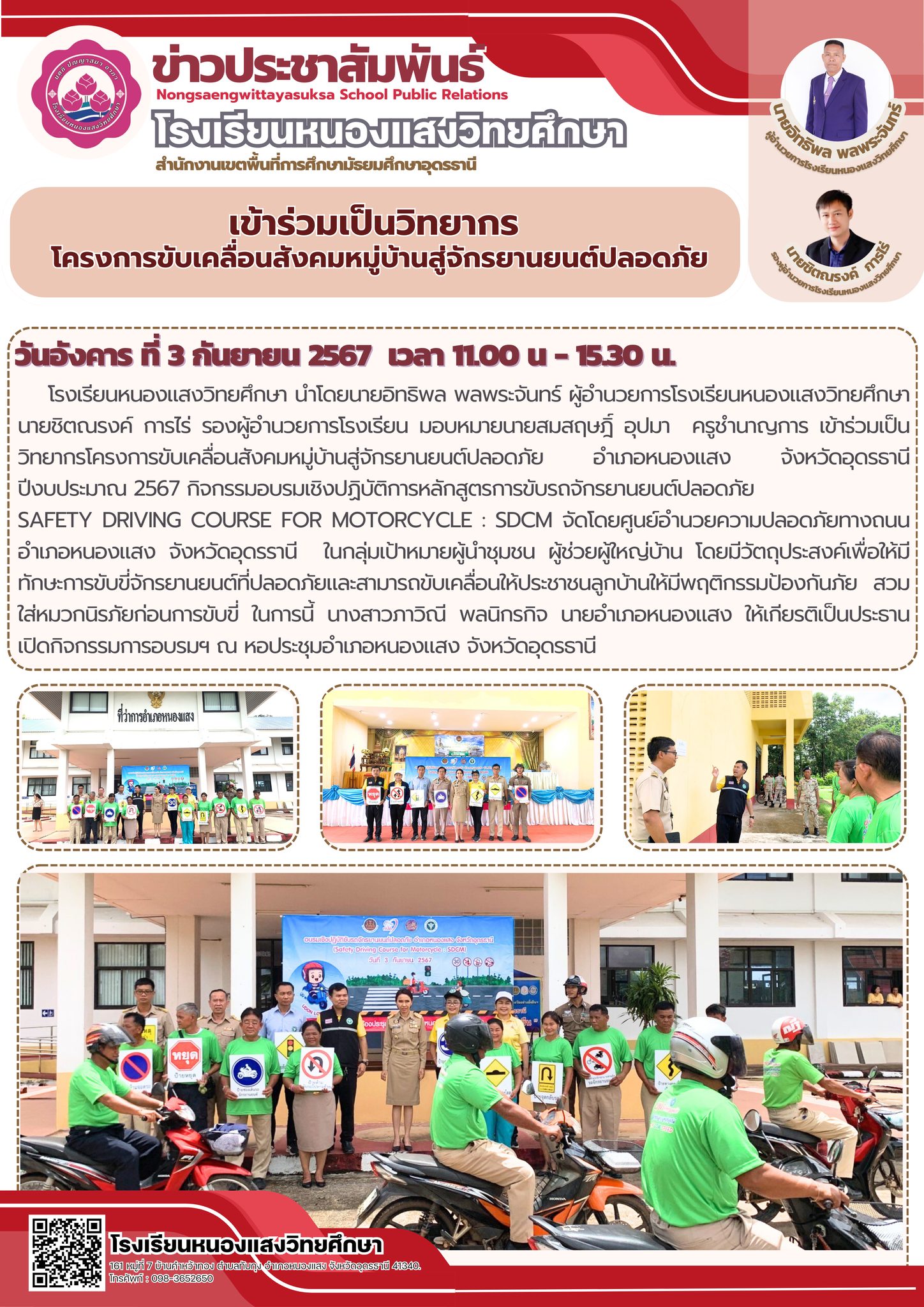 โรงเรียนหนองแสงวิทยศึกษา นำโดยนายอิทธิพล พลพระจันทร์ ผู้อำนวยการโรงเรียนหนองแสงวิทยศึกษา นายชิตณรงค์ การไร่ รองผู้อำนวยการโรงเรียน มอบหมายนายสมสฤษฎิ์ อุปมา ครูชำนาญการ เข้าร่วมเป็นวิทยากรโครงการขับเคลื่อนสังคมหมู่บ้านสู่จักรยานยนต์ปลอดภัย อำเภอหนองแสง จ้งหวัดอุดรธานีปีงบประมาณ 2567 กิจกรรมอบรมเชิงปฏิบัติการหลักสูตรการขับรถจักรยานยนต์ปลอดภัย Safety Driving course for Motorcycle : SDCM จัดโดยศูนย์อำนวยความปลอดภัยทางถนนอำเภอหนองแสง จังหวัดอุดรรานี ในกลุ่มเป้าหมายผู้นำชุมชน ผู้ช่วยผู้ใหญ่บ้าน โดยมีวัตถุประสงค์เพื่อให้มีทักษะการขับขี่จักรยานยนต์ที่ปลอดภัยและสามารถขับเคลื่อนให้ประชาชนลูกบ้านให้มีพฤติกรรมป้องกันภัย สวมใส่หมวกนิรภัยก่อนการขับขี่ ในการนี้ นางสาวภาวิณี พลนิกรกิจ นายอำเภอหนองแสง ให้เกียรติเป็นประธานเปิดกิจกรรมการอบรมฯ ณ หอประชุมอำเภอหนองแสง จังหวัดอุดรธานี