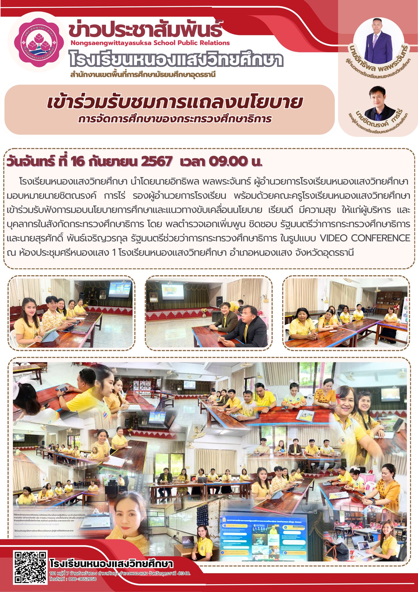 โรงเรียนหนองแสงวิทยศึกษา นำโดยนายอิทธิพล พลพระจันทร์ ผู้อำนวยการโรงเรียนหนองแสงวิทยศึกษามอบหมายนายชิตณรงค์ การไร่ รองผู้อำนวยการโรงเรียน พร้อมด้วยคณะครูโรงเรียนหนองแสงวิทยศึกษา เข้าร่วมรับฟังการมอบนโยบายการศึกษาและแนวทางขับเคลื่อนนโยบาย เรียนดี มีความสุข ให้แก่ผู้บริหาร และบุคลากรในสังกัดกระทรวงศึกษาธิการ โดย พลตำรวจเอกเพิ่มพูน ชิดชอบ รัฐมนตรีว่าการกระทรวงศึกษาธิการ และนายสุรศักดิ์ พันธ์เจริญวรกุล รัฐมนตรีช่วยว่าการกระทรวงศึกษาธิการ ในรูปแบบ Video Conference ณ ห้องประชุมศรีหนองแสง 1 โรงเรียนหนองแสงวิทยศึกษา อำเภอหนองแสง จังหวัดอุดรธานี
