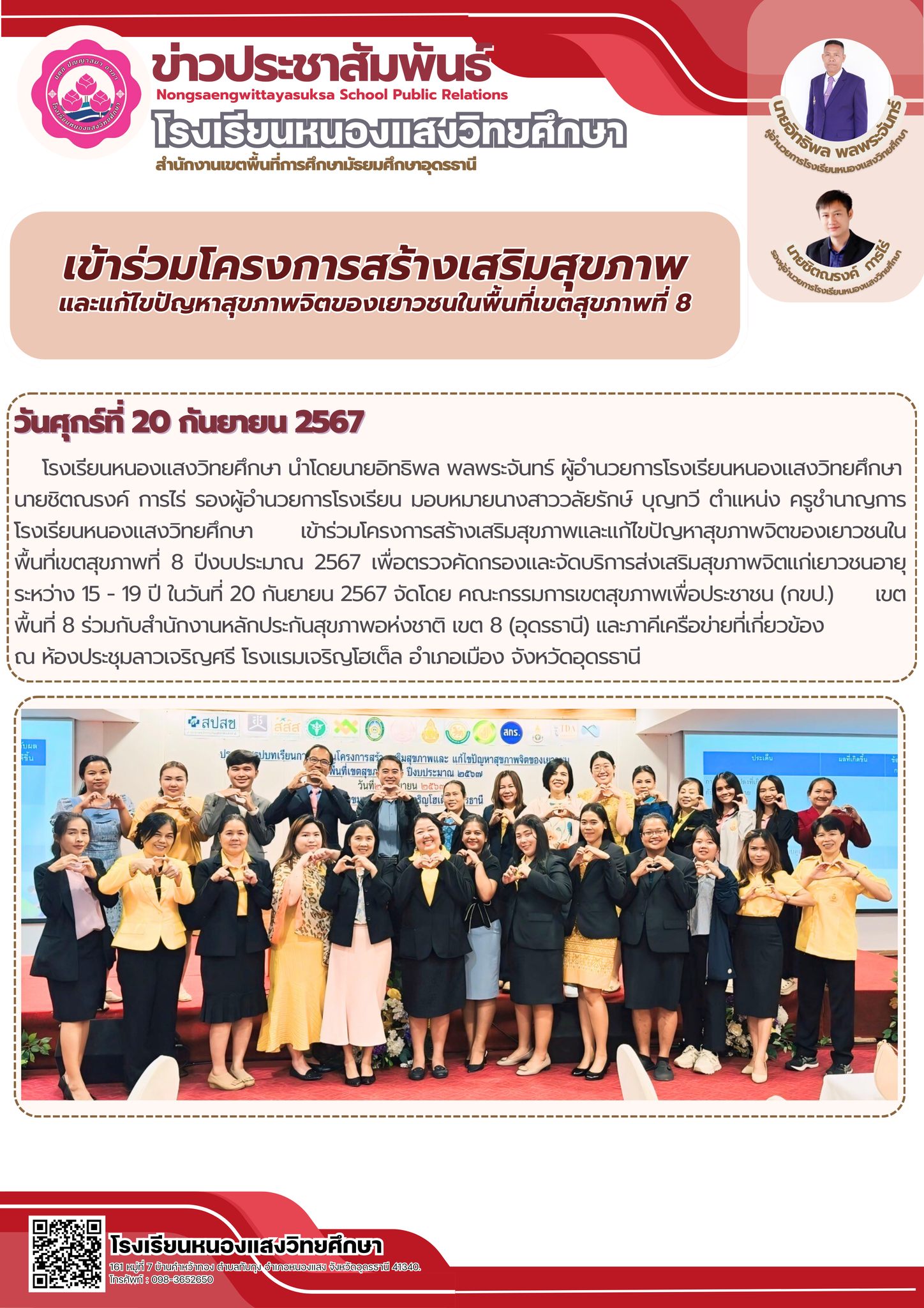 โรงเรียนหนองแสงวิทยศึกษา นำโดยนายอิทธิพล พลพระจันทร์ ผู้อำนวยการโรงเรียนหนองแสงวิทยศึกษา นายชิตณรงค์ การไร่ รองผู้อำนวยการโรงเรียน มอบหมายนางสาววลัยรักษ์ บุญทวี ตำแหน่ง ครูชำนาญการ โรงเรียนหนองแสงวิทยศึกษา เข้าร่วมโครงการสร้างเสริมสุขภาพและแก้ไขปัญหาสุขภาพจิตของเยาวชนในพื้นที่เขตสุขภาพที่ 8 ปีงบประมาณ 2567 เพื่อตรวจคัดกรองและจัดบริการส่งเสริมสุขภาพจิตแก่เยาวชนอายุระหว่าง 15 - 19 ปี ในวันที่ 20 กันยายน 2567 จัดโดย คณะกรรมการเขตสุขภาพเพื่อประชาชน (กขป.) เขตพื้นที่ 8 ร่วมกับสำนักงานหลักประกันสุขภาพอห่งชาติ เขต 8 (อุดรธานี) และภาคีเครือข่ายที่เกี่ยวข้อง