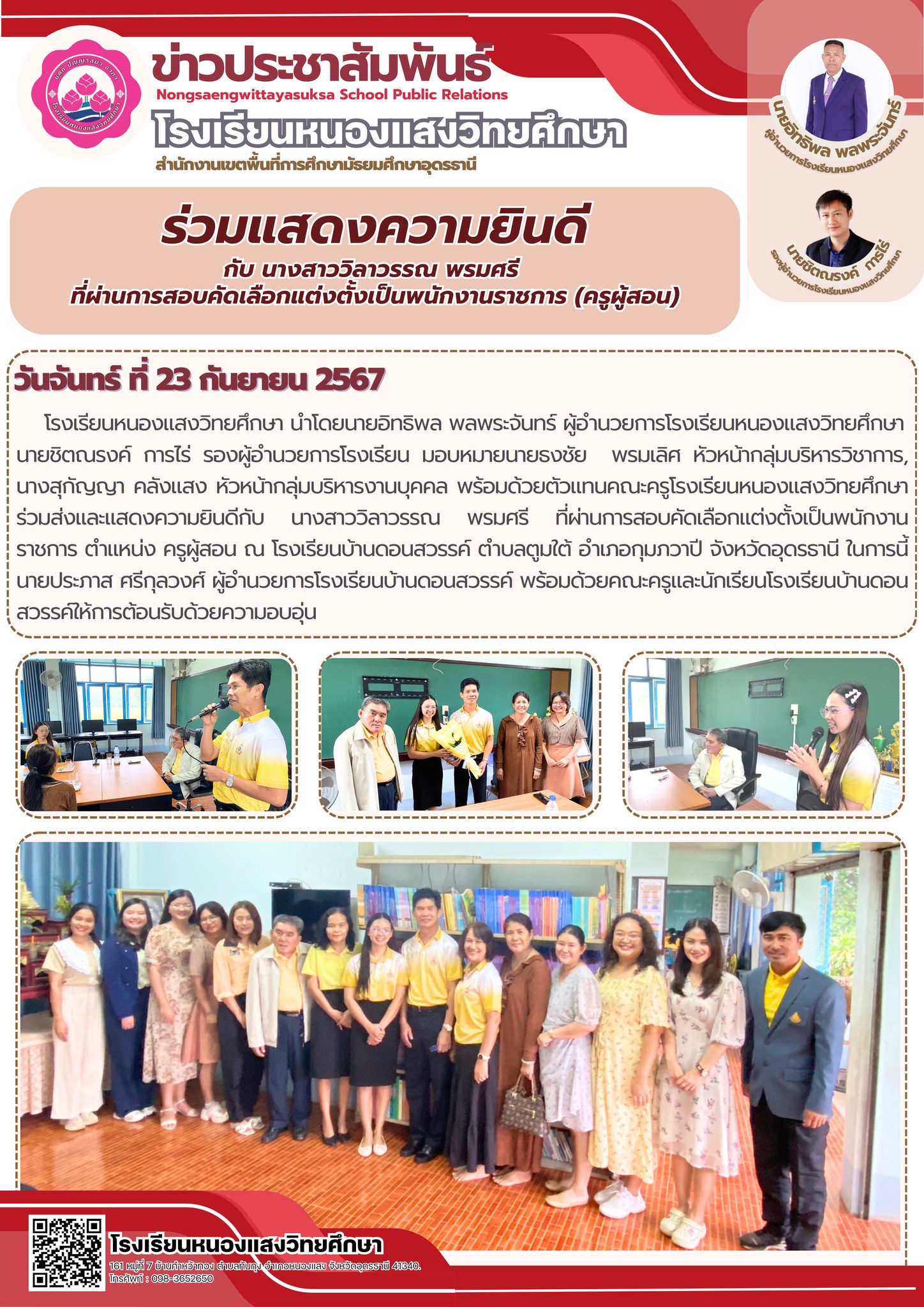 โรงเรียนหนองแสงวิทยศึกษา นำโดยนายอิทธิพล พลพระจันทร์ ผู้อำนวยการโรงเรียนหนองแสงวิทยศึกษา นายชิตณรงค์ การไร่ รองผู้อำนวยการโรงเรียน มอบหมายนายธงชัย พรมเลิศ หัวหน้ากลุ่มบริหารวิชาการ, นางสุกัญญา คลังแสง หัวหน้ากลุ่มบริหารงานบุคคล พร้อมด้วยตัวแทนคณะครูโรงเรียนหนองแสงวิทยศึกษา ร่วมส่งและแสดงความยินดีกับ นางสาววิลาวรรณ พรมศรี ที่ผ่านการสอบคัดเลือกแต่งตั้งเป็นพนักงานราชการ ตำแหน่ง ครูผู้สอน ณ โรงเรียนบ้านดอนสวรรค์ ตำบลตูมใต้ อำเภอกุมภวาปี จังหวัดอุดรธานี ในการนี้นายประภาส ศรีกุลวงศ์ ผู้อำนวยการโรงเรียนบ้านดอนสวรรค์ พร้อมด้วยคณะครูและนักเรียนโรงเรียนบ้านดอนสวรรค์ให้การต้อนรับด้วยความอบอุ่น