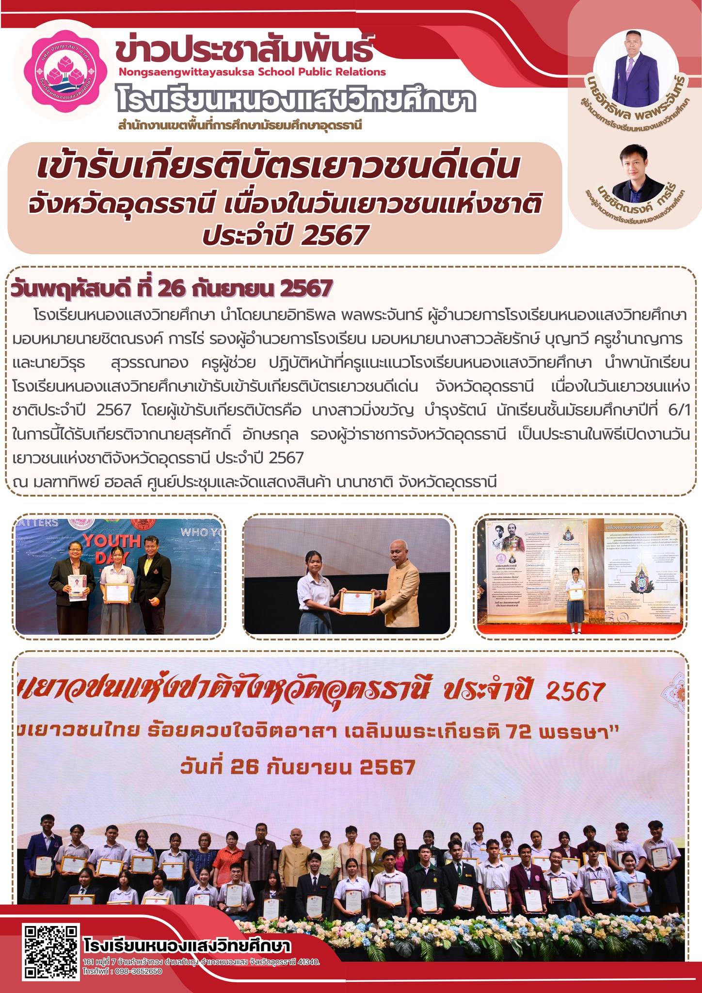 โรงเรียนหนองแสงวิทยศึกษา นำโดยนายอิทธิพล พลพระจันทร์ ผู้อำนวยการโรงเรียนหนองแสงวิทยศึกษา มอบหมายนายชิตณรงค์ การไร่ รองผู้อำนวยการโรงเรียน มอบหมายนางสาววลัยรักษ์ บุญทวี ครูชำนาญการ และนายวิรุธ สุวรรณทอง ครูผู้ช่วย ปฏิบัติหน้าที่ครูแนะแนวโรงเรียนหนองแสงวิทยศึกษา นำพานักเรียนโรงเรียนหนองแสงวิทยศึกษาเข้ารับเข้ารับเกียรติบัตรเยาวชนดีเด่น จังหวัดอุดรธานี เนื่องในวันเยาวชนแห่งชาติประจำปี 2567 โดยผู้เข้ารับเกียรติบัตรคือ นางสาวมิ่งขวัญ บำรุงรัตน์ นักเรียนชั้นมัธยมศึกษาปีที่ 6/1 ในการนี้ได้รับเกียรติจากนายสุรศักดิ์ อักษรกุล รองผู้ว่าราชการจังหวัดอุดรธานี เป็นประธานในพิธีเปิดงานวันเยาวชนแห่งชาติจังหวัดอุดรธานี ประจำปี 2567