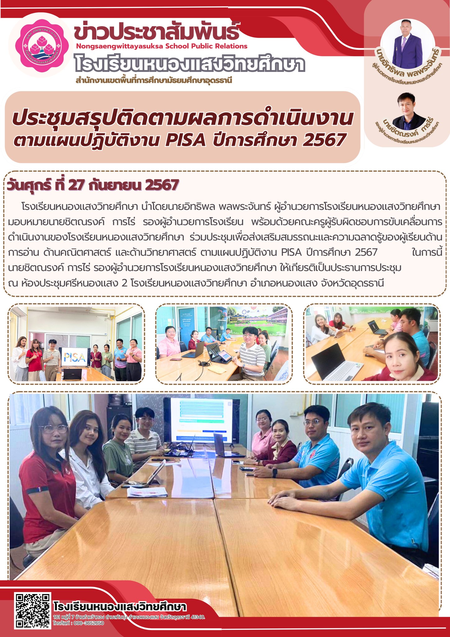 โรงเรียนหนองแสงวิทยศึกษา นำโดยนายอิทธิพล พลพระจันทร์ ผู้อำนวยการโรงเรียนหนองแสงวิทยศึกษามอบหมายนายชิตณรงค์ การไร่ รองผู้อำนวยการโรงเรียน พร้อมด้วยคณะครูผู้รับผิดชอบการขับเคลื่อนการดำเนินงานของโรงเรียนหนองแสงวิทยศึกษา ร่วมประชุมเพื่อส่งเสริมสมรรถนะและความฉลาดรู้ของผู้เรียนด้านการอ่าน ด้านคณิตศาสตร์ และด้านวิทยาศาสตร์ ตามแผนปฏิบัติงาน PISA ปีการศึกษา 2567 ในการนี้นายชิตณรงค์ การไร่ รองผู้อำนวยการโรงเรียนหนองแสงวิทยศึกษา ให้เกียรติเป็นประธานการประชุม