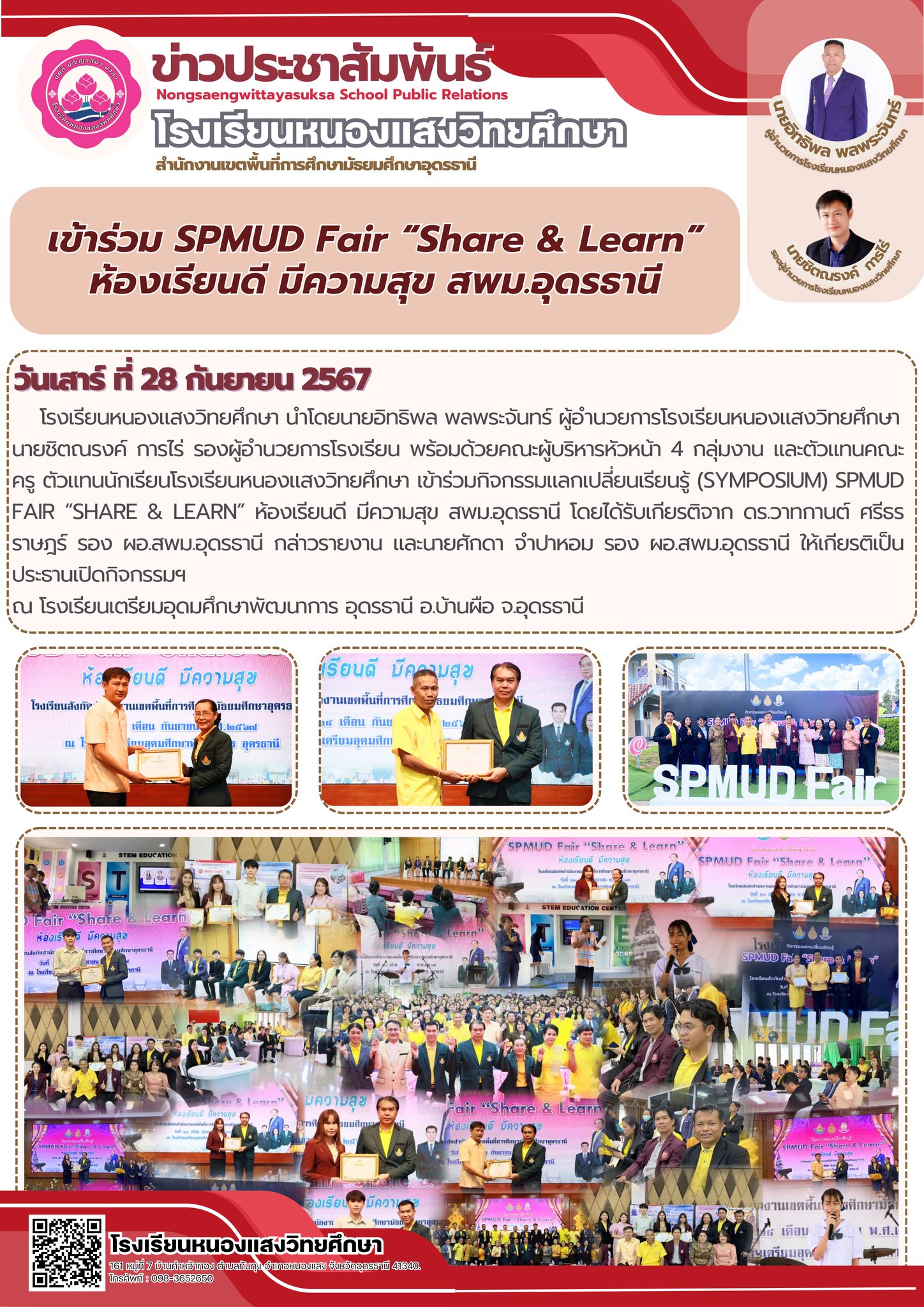 โรงเรียนหนองแสงวิทยศึกษา นำโดยนายอิทธิพล พลพระจันทร์ ผู้อำนวยการโรงเรียนหนองแสงวิทยศึกษา นายชิตณรงค์ การไร่ รองผู้อำนวยการโรงเรียน พร้อมด้วยคณะผู้บริหารหัวหน้า 4 กลุ่มงาน และตัวแทนคณะครู ตัวแทนนักเรียนโรงเรียนหนองแสงวิทยศึกษา เข้าร่วมกิจกรรมแลกเปลี่ยนเรียนรู้ (Symposium) SPMUD Fair “Share & Learn” ห้องเรียนดี มีความสุข สพม.อุดรธานี โดยได้รับเกียรติจาก ดร.วาทกานต์ ศรีธรราษฎร์ รอง ผอ.สพม.อุดรธานี กล่าวรายงาน และนายศักดา จำปาหอม รอง ผอ.สพม.อุดรธานี ให้เกียรติเป็นประธานเปิดกิจกรรมฯ