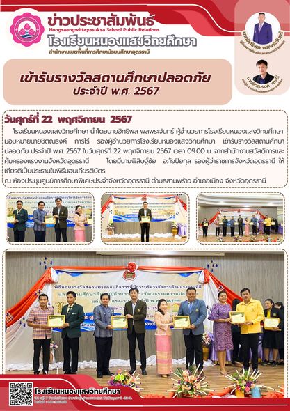 โรงเรียนหนองแสงวิทยศึกษา นำโดยนายอิทธิพล พลพระจันทร์ ผู้อำนวยการโรงเรียนหนองแสงวิทยศึกษา มอบหมายนายชิตณรงค์ การไร่ รองผู้อำนวยการโรงเรียนหนองแสงวิทยศึกษา เข้ารับรางวัลสถานศึกษาปลอดภัย ประจำปี พ.ศ. 2567 ในวันศุกร์ที่ 22 พฤศจิกายน 2567 เวลา 09.00 น. จากสำนักงานสวัสดิการและคุ้มครองแรงงานจังหวัดอุดรธานี โดยมีนายพิสิษฐ์ชัย อภัยปิยกุล รองผู้ว่าราชการจังหวัดอุดรธานี ให้เกียรติเป็นประธานในพิธีมอบเกียรติบัตร ณ ห้องประชุมศูนย์การศึกษาพิเศษประจำจังหวัดอุดรธานี ตำบลสามพร้าว อำเภอเมือง จังหวัดอุดรธานี