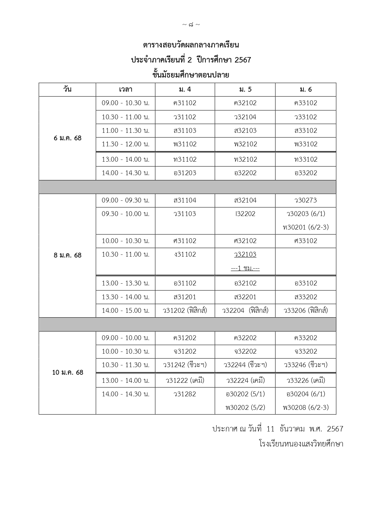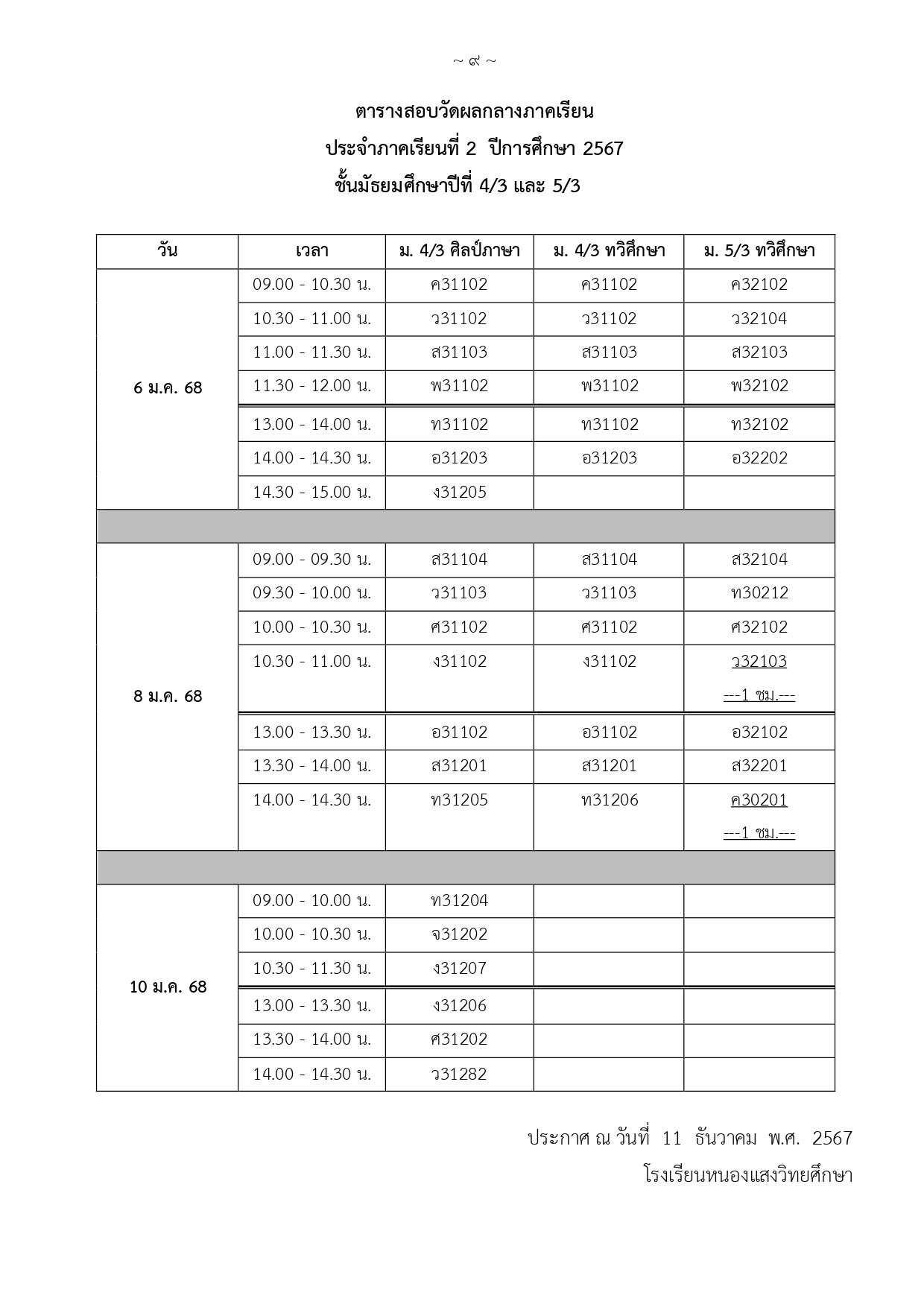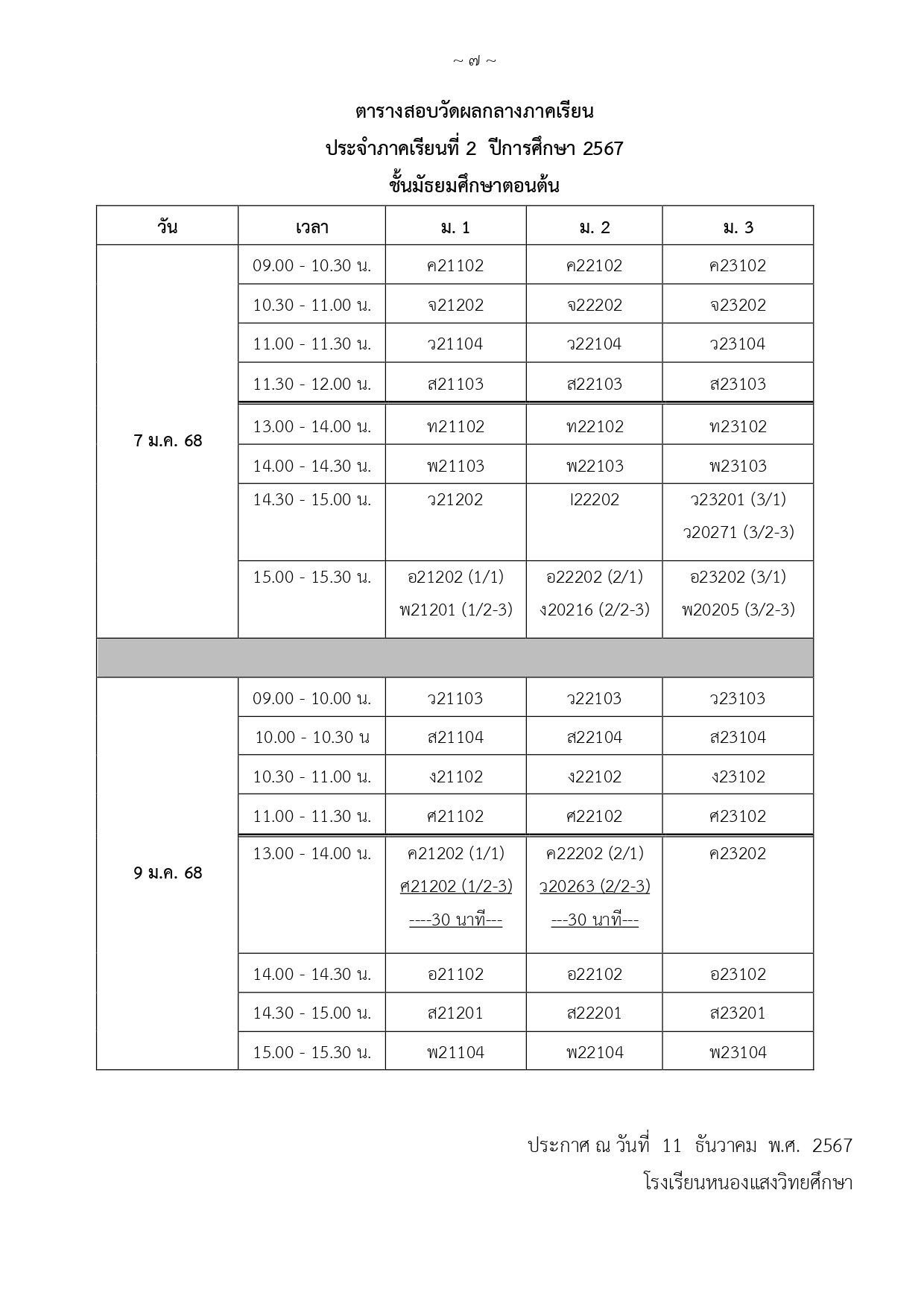 กำหนดการสอบกลางภาคเรียนที่ 2 ปีการศึกษา 2567