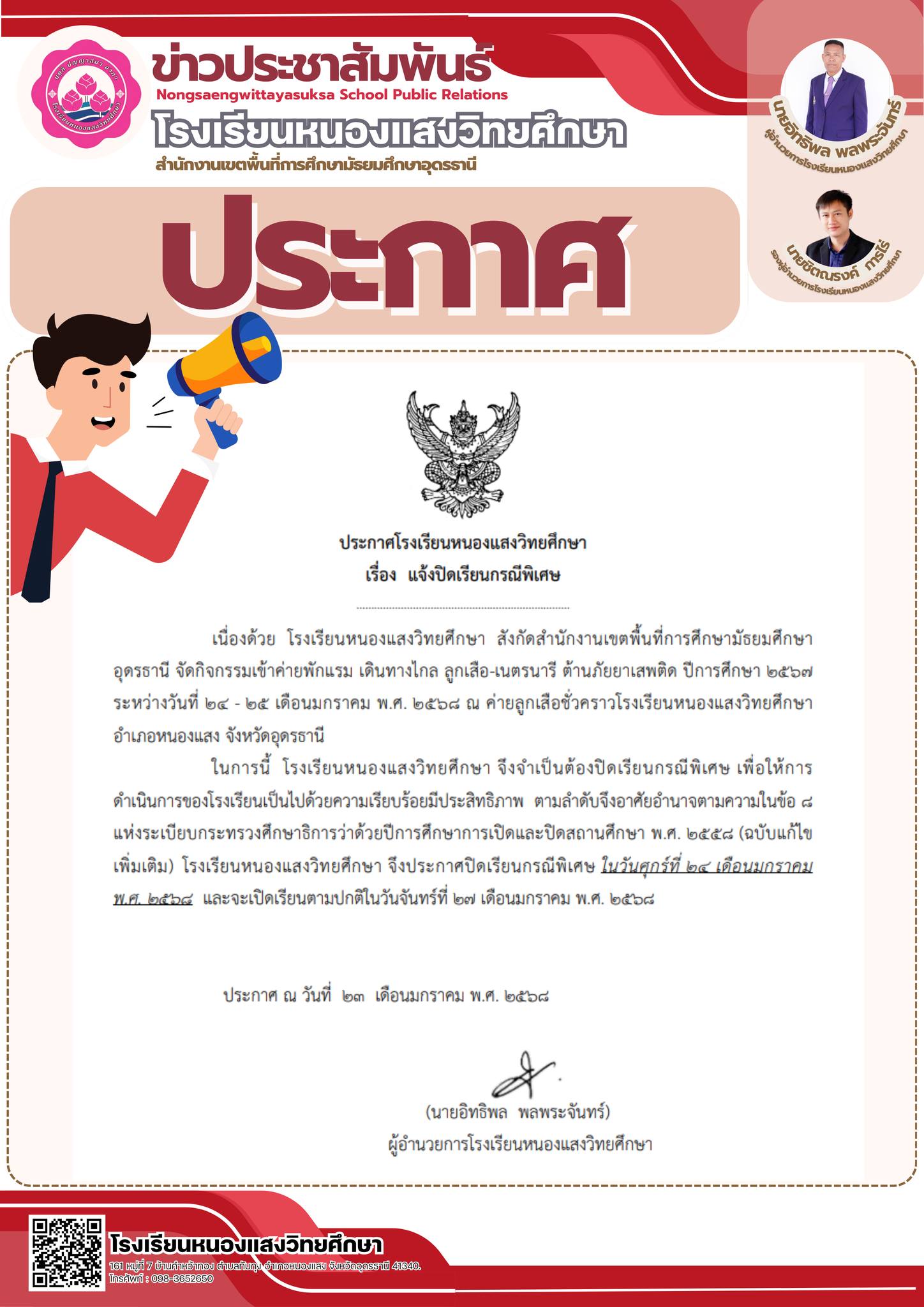 #ประกาศหยุดเรียนกรณีพิเศษวันศุกร์ที่ 24 มกราคม 2568