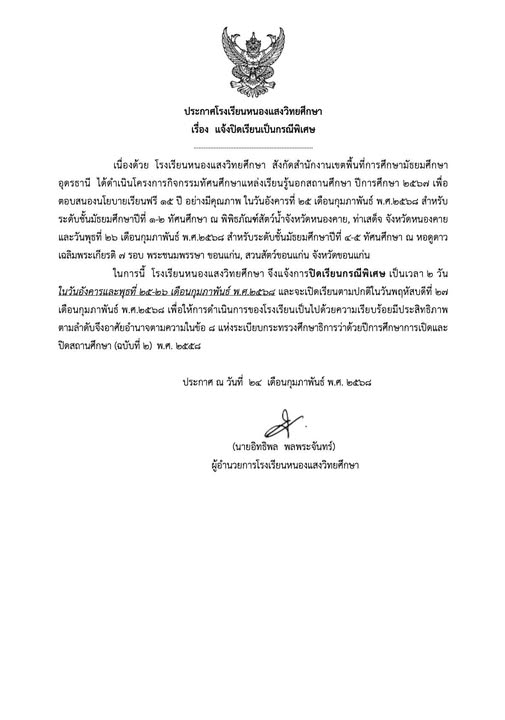 ในการนี้ โรงเรียนหนองแสงวิทยศึกษา จึงแจ้งการปิดเรียนกรณีพิเศษ เป็นเวลา ๒ วัน ในวันอังคารและพุธที่ ๒๕-๒๖ เดือนกุมภาพันธ์ พ.ศ.๒๕๖๘ และจะเปิดเรียนตามปกติในวันพฤหัสบดีที่ ๒๗ เดือนกุมภาพันธ์ พ.ศ.๒๕๖๘ เพื่อให้การดำเนินการของโรงเรียนเป็นไปด้วยความเรียบร้อยมีประสิทธิภาพตามลำดับจึงอาศัยอำนาจตามความในข้อ ๘ แห่งระเบียบกระทรวงศึกษาธิการว่าด้วยปีการศึกษาการเปิดและปิดสถานศึกษา (ฉบับที่ ๒) พ.ศ. ๒๕๕๘