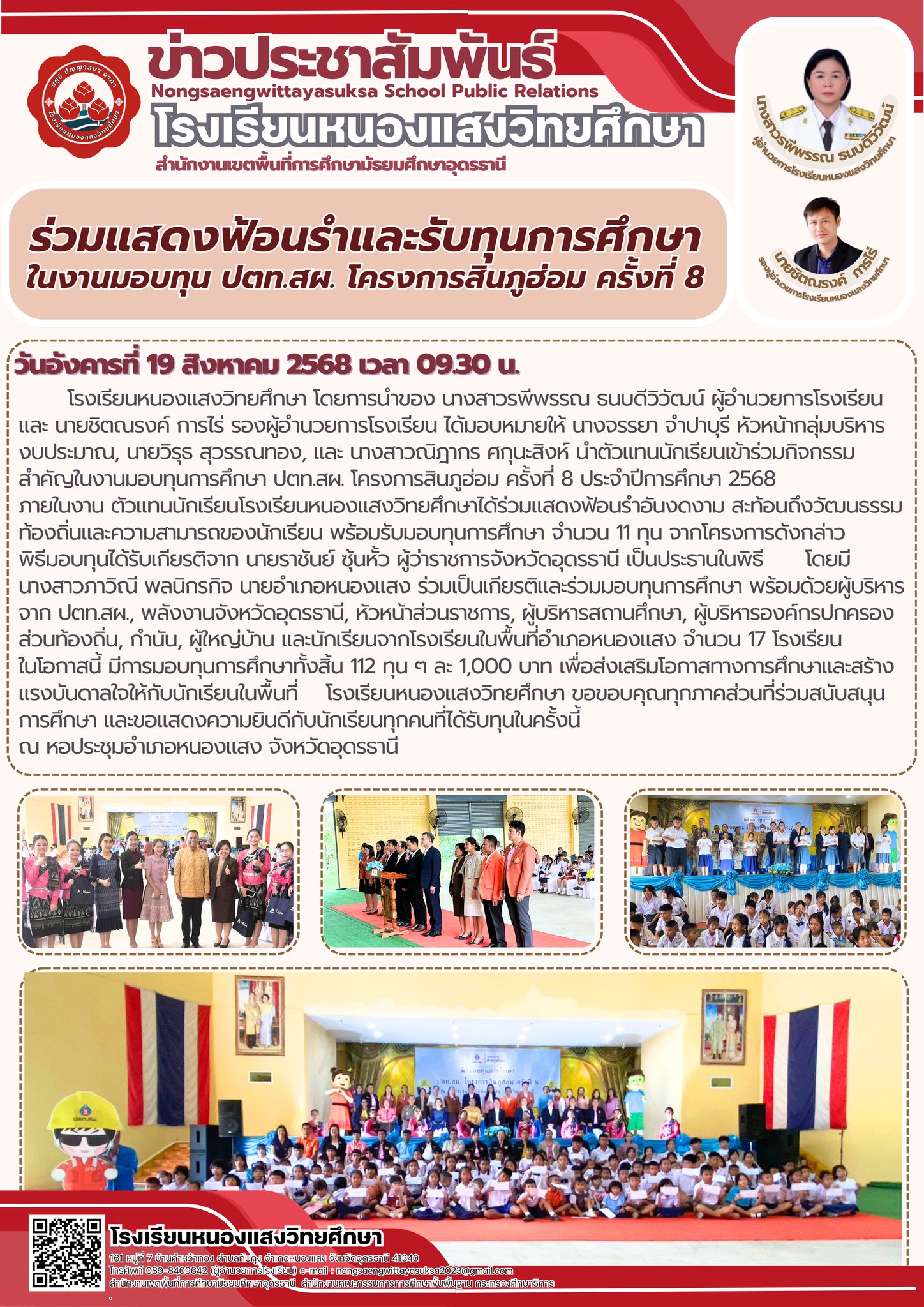 🎉 โรงเรียนหนองแสงวิทยศึกษา ร่วมงานมอบทุน ปตท.สผ. โครงการสินภูฮ่อม ครั้งที่ 8