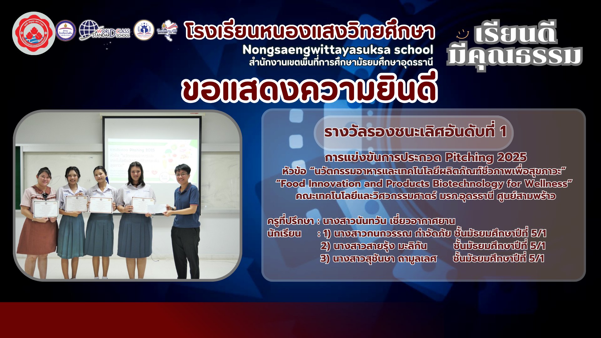 🏆✨ ขอแสดงความยินดีกับนักเรียนโรงเรียนหนองแสงวิทยศึกษา คว้ารางวัล รองชนะเลิศอันดับ 1 ในการแข่งขันการประกวด Pitching 2025