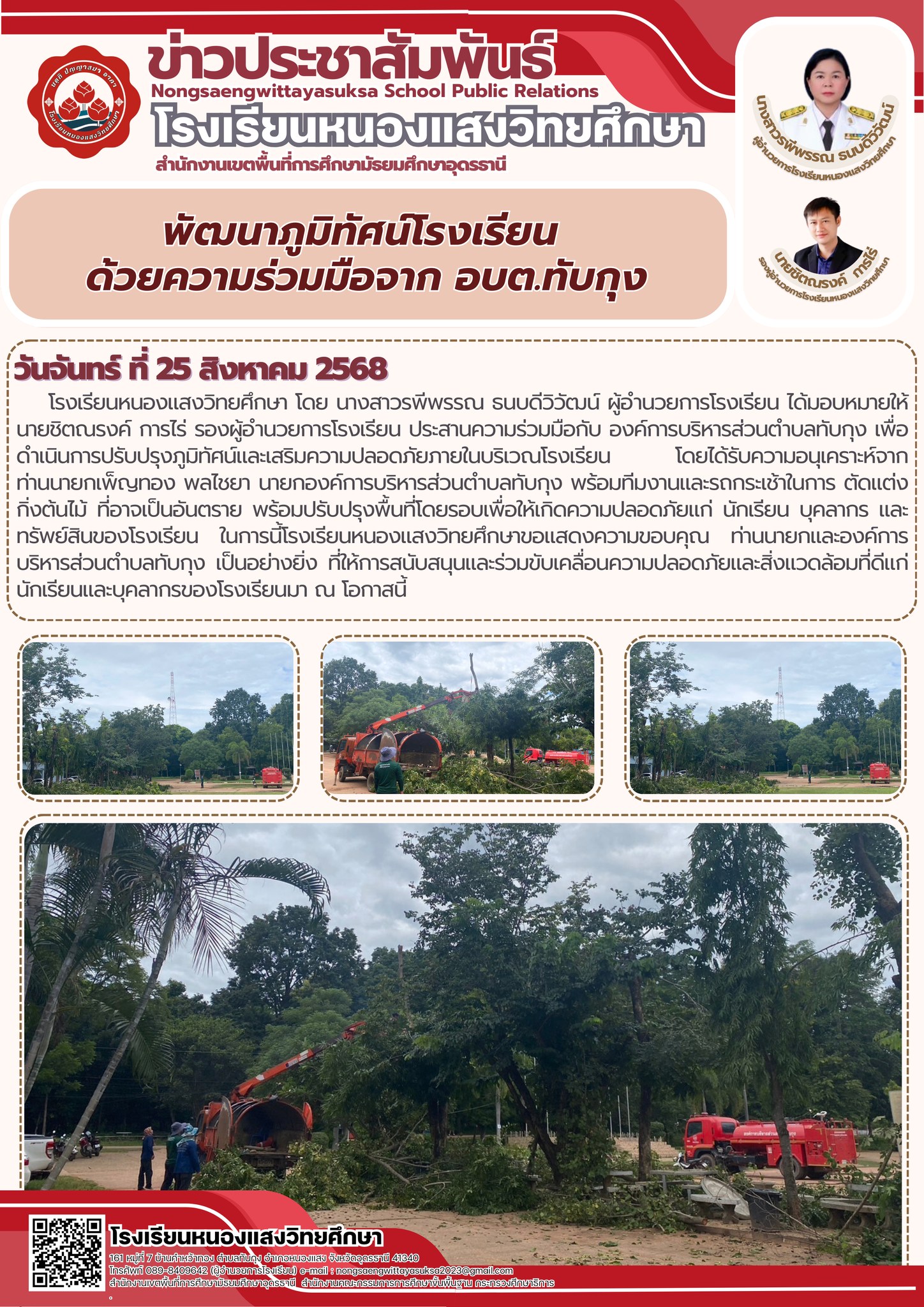 ในโอกาสนี้ โรงเรียนได้รับความอนุเคราะห์จาก ท่านนายกเพ็ญทอง พลไชยา นายกองค์การบริหารส่วนตำบลทับกุง พร้อมทีมงานและรถกระเช้าในการตัดแต่งกิ่งไม้ที่อาจเป็นอันตราย และปรับปรุงพื้นที่โดยรอบให้เกิดความปลอดภัยแก่ นักเรียน บุคลากร และทรัพย์สินของโรงเรียน