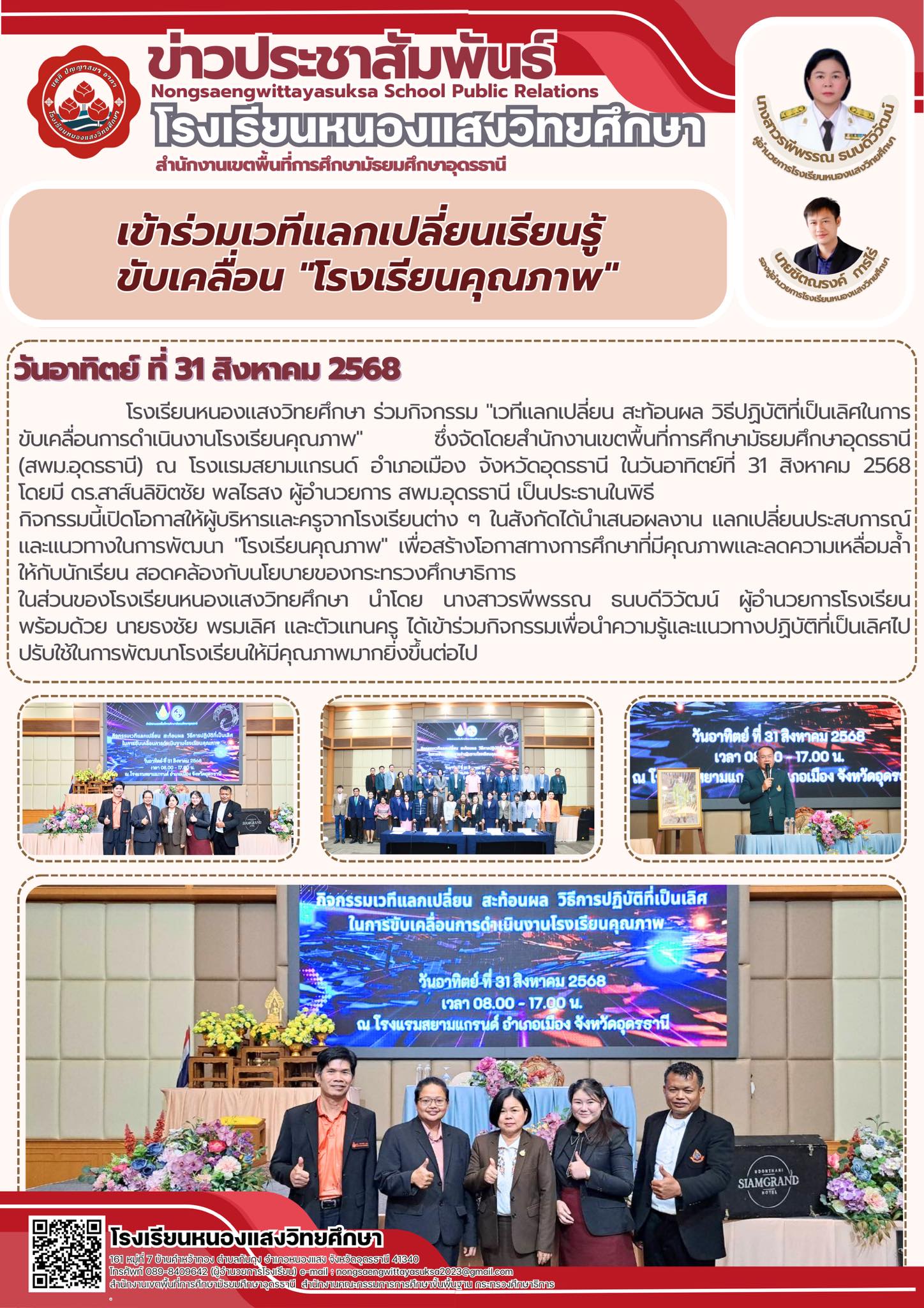 โรงเรียนหนองแสงวิทยศึกษา ร่วมกิจกรรม "เวทีแลกเปลี่ยน สะท้อนผล วิธีปฏิบัติที่เป็นเลิศในการขับเคลื่อนการดำเนินงานโรงเรียนคุณภาพ" ซึ่งจัดโดยสำนักงานเขตพื้นที่การศึกษามัธยมศึกษาอุดรธานี (สพม.อุดรธานี) ณ โรงแรมสยามแกรนด์ อ.เมือง จ.อุดรธานี ในวันอาทิตย์ที่ 31 สิงหาคม 2568 โดยมี ดร.สาส์นลิขิตชัย พลไธสง ผู้อำนวยการ สพม.อุดรธานี เป็นประธานกิจกรรมนี้จัดขึ้นเพื่อเปิดโอกาสให้ผู้บริหารและครูในสังกัดได้แลกเปลี่ยนประสบการณ์และนำเสนอผลงาน "โรงเรียนคุณภาพ" ซึ่งสอดคล้องกับนโยบายของกระทรวงศึกษาธิการ ที่มุ่งเน้นการยกระดับคุณภาพการศึกษาและลดความเหลื่อมล้ำทางการศึกษา ในงานนี้ โรงเรียนหนองแสงวิทยศึกษา นำโดย นางสาวรพีพรรณ ธนบดีวิวัฒน์ ผู้อำนวยการโรงเรียน พร้อมด้วย นายธงชัย พรมเลิศ และตัวแทนครู ได้เข้าร่วมกิจกรรมอย่างเต็มที่ เพื่อนำความรู้และแนวทางปฏิบัติที่เป็นเลิศไปปรับใช้ในการพัฒนาโรงเรียนของเราให้มีคุณภาพมากยิ่งขึ้นต่อไปค่ะ