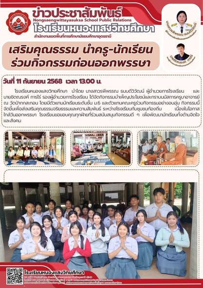 ภายใต้การนำของ นางสาวรพีพรรณ ธนบดีวิวัฒน์ ผู้อำนวยการโรงเรียน และ นายชิตณรงค์ การไร่ รองผู้อำนวยการโรงเรียน โรงเรียนหนองแสงวิทยศึกษาได้จัดกิจกรรมบำเพ็ญประโยชน์และกราบนมัสการคารวะครูบาอาจารย์ ณ วัดป่ากกสะทอน อำเภอเมือง จังหวัดอุดรธานี เนื่องในโอกาสใกล้วันออกพรรษา